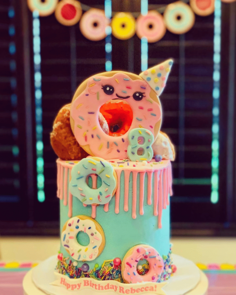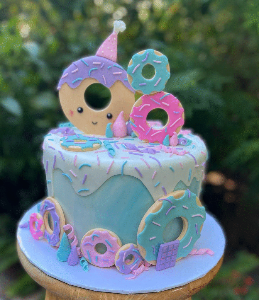 This adorable cake is a donut lover’s dream, with a large fondant donut featuring a cute face sitting at the top. The vibrant pink and blue icing is complemented by a colorful drip effect, while smaller donuts surround the base, each adorned with playful sprinkles.