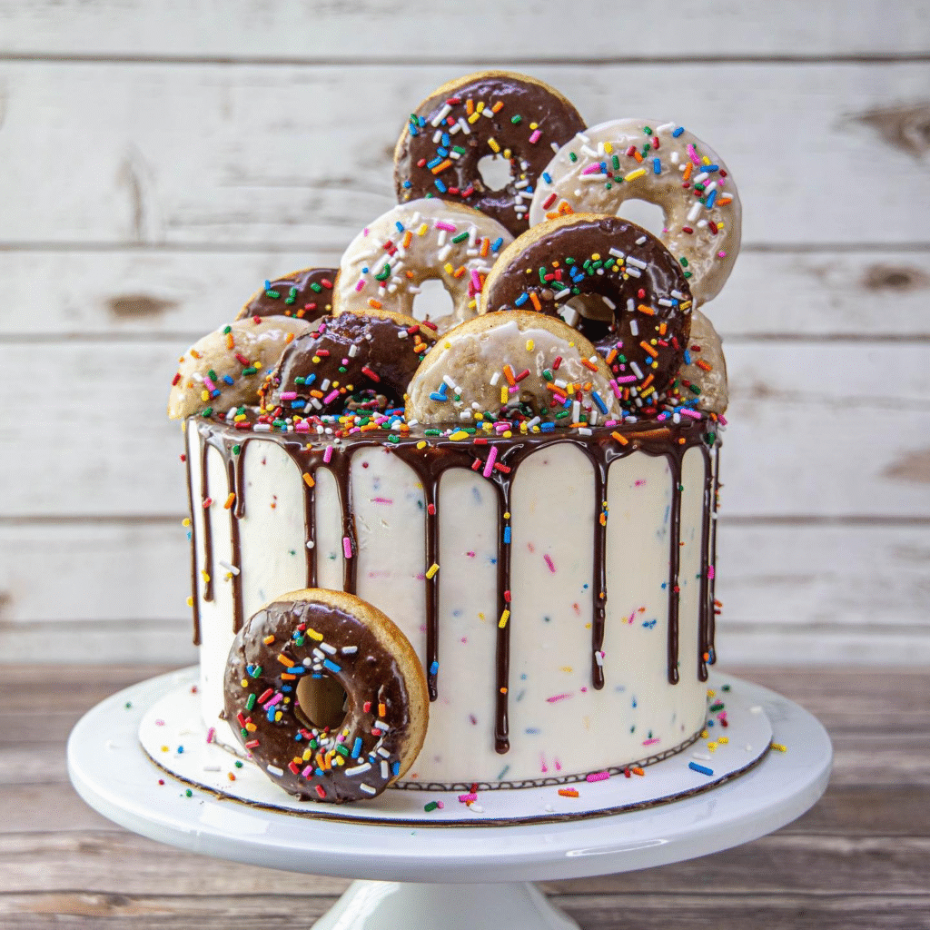 What Makes This Image Stand Out: This cake stands out for its playful donut theme, bright sprinkles, and rich chocolate drizzle.