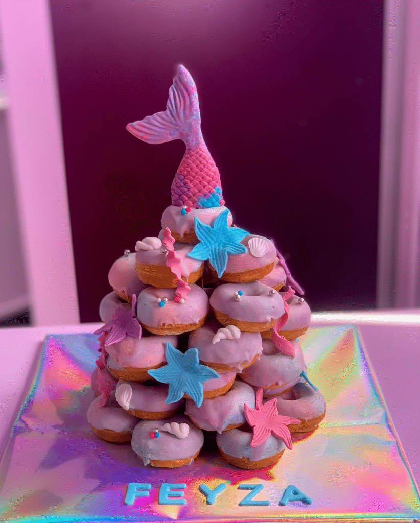 This stunning donut cake features a mermaid tail rising from the top, adding a magical touch to the whimsical design. The donuts are coated in pastel pink and purple icing, with vibrant starfish and seashell decorations scattered throughout.