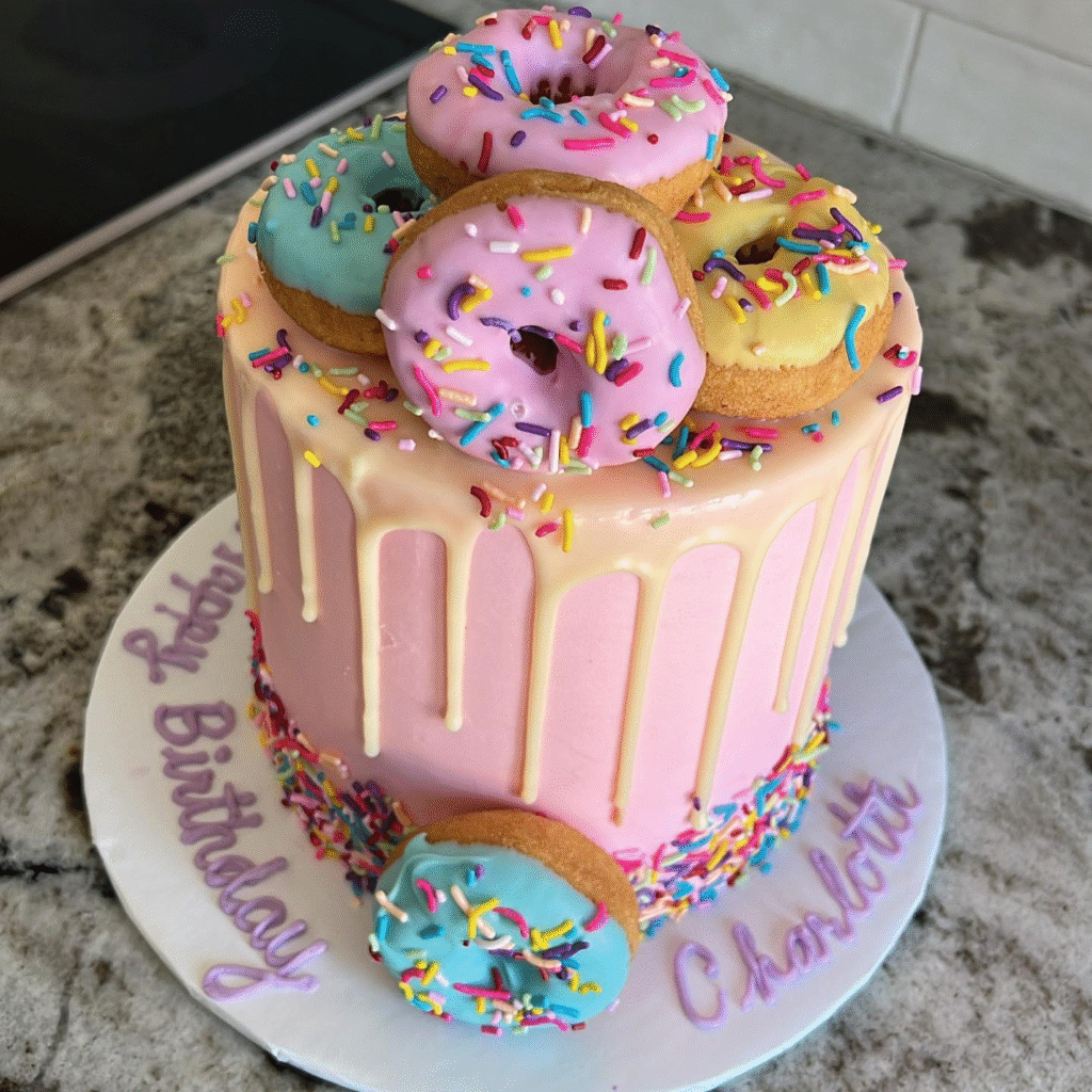 What Makes This Image Stand Out: This cake stands out for its playful use of colorful sprinkles, chocolate drizzle, and vibrant donut toppings.