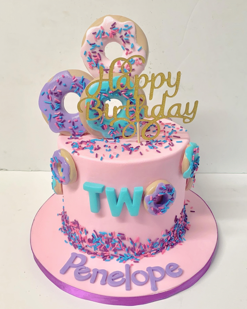 What Makes This Image Stand Out: This cake stands out for its fun and playful donut theme, with colorful sprinkles, a bright “TWO,” and personalized details.
