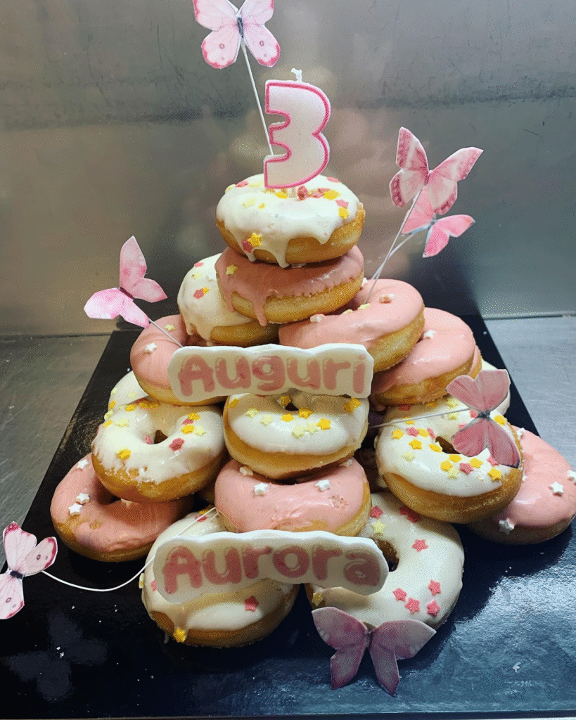 This donut tower features a stack of colorful donuts, each topped with pink and white icing and sprinkled with tiny stars, making it a charming centerpiece for any celebration. The playful arrangement includes a “3” candle, marking the special birthday, while the cute butterflies gently float around the tower, adding a whimsical touch.