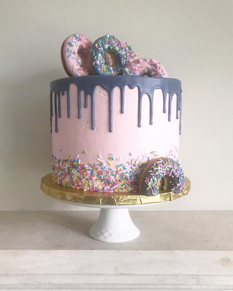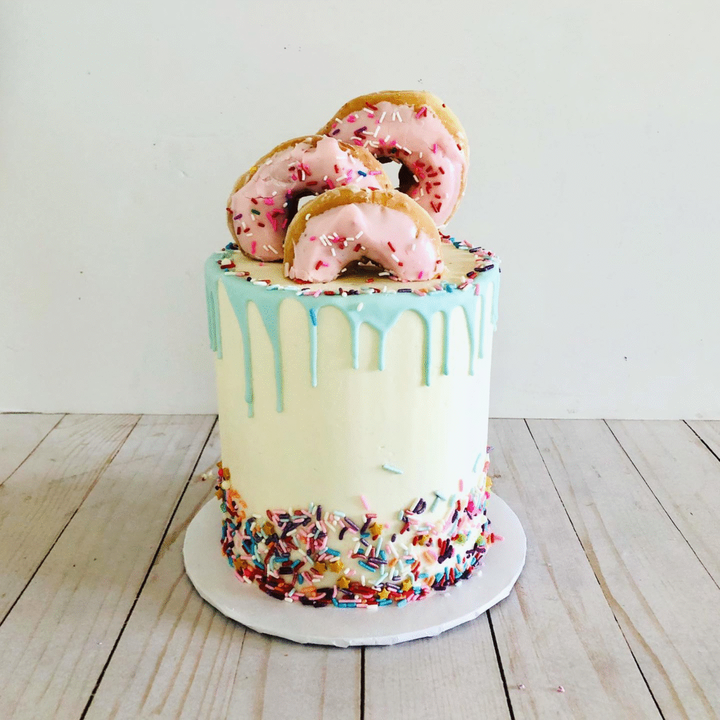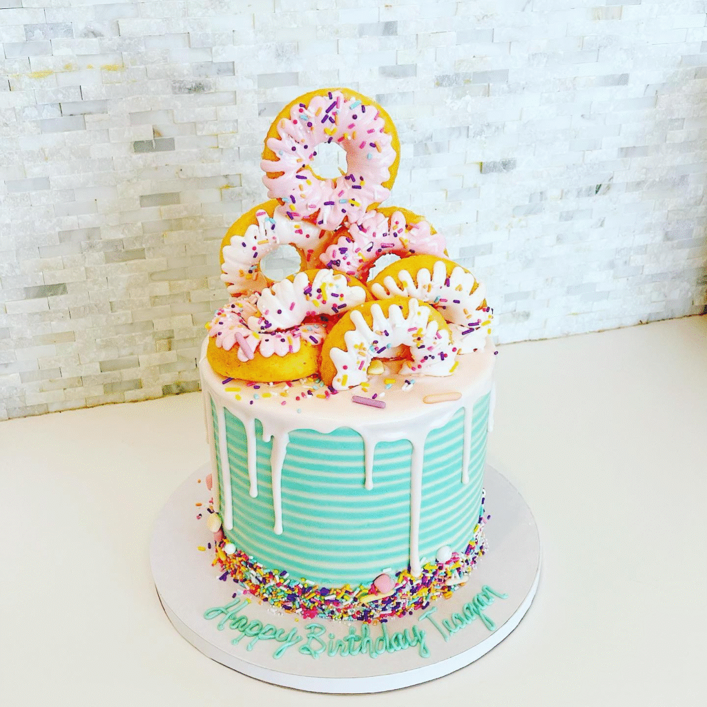 What Makes This Image Stand Out: This cake stands out with its colorful drip design, playful donuts, and vibrant sprinkles.