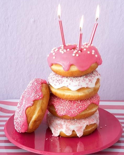 This donut tower features layers of freshly glazed donuts, each topped with sweet pink icing and vibrant sprinkles. The three birthday candles perched on top add a festive touch, perfect for a fun celebration.