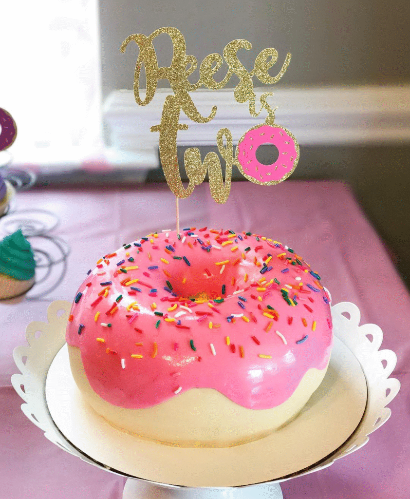 This donut-shaped cake is topped with a glossy pink glaze and colorful sprinkles, making it a playful and sweet treat for any celebration. The sparkling golden “Reese is TWO” topper adds a special touch, celebrating a milestone in style.
