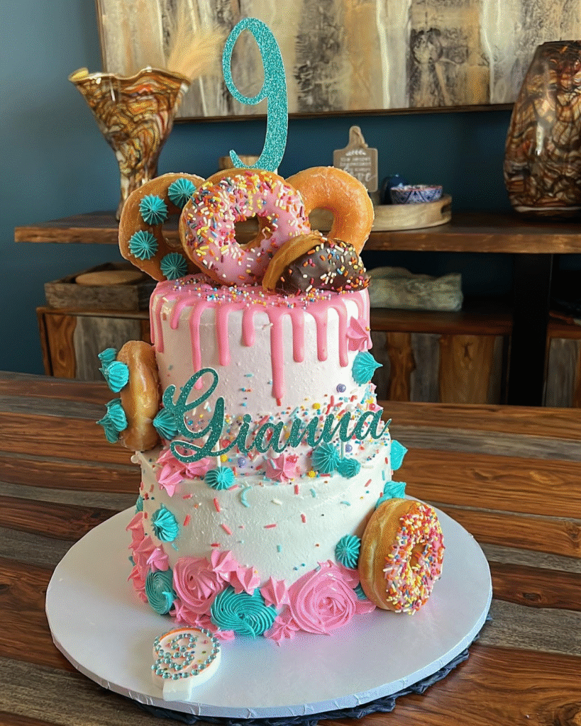 This playful two-tier cake features donuts adorned with colorful sprinkles and a glossy pink drip effect, making it an eye-catching centerpiece. The cake is topped with a sparkling “9” birthday candle and personalized with the name “Granma” in teal.