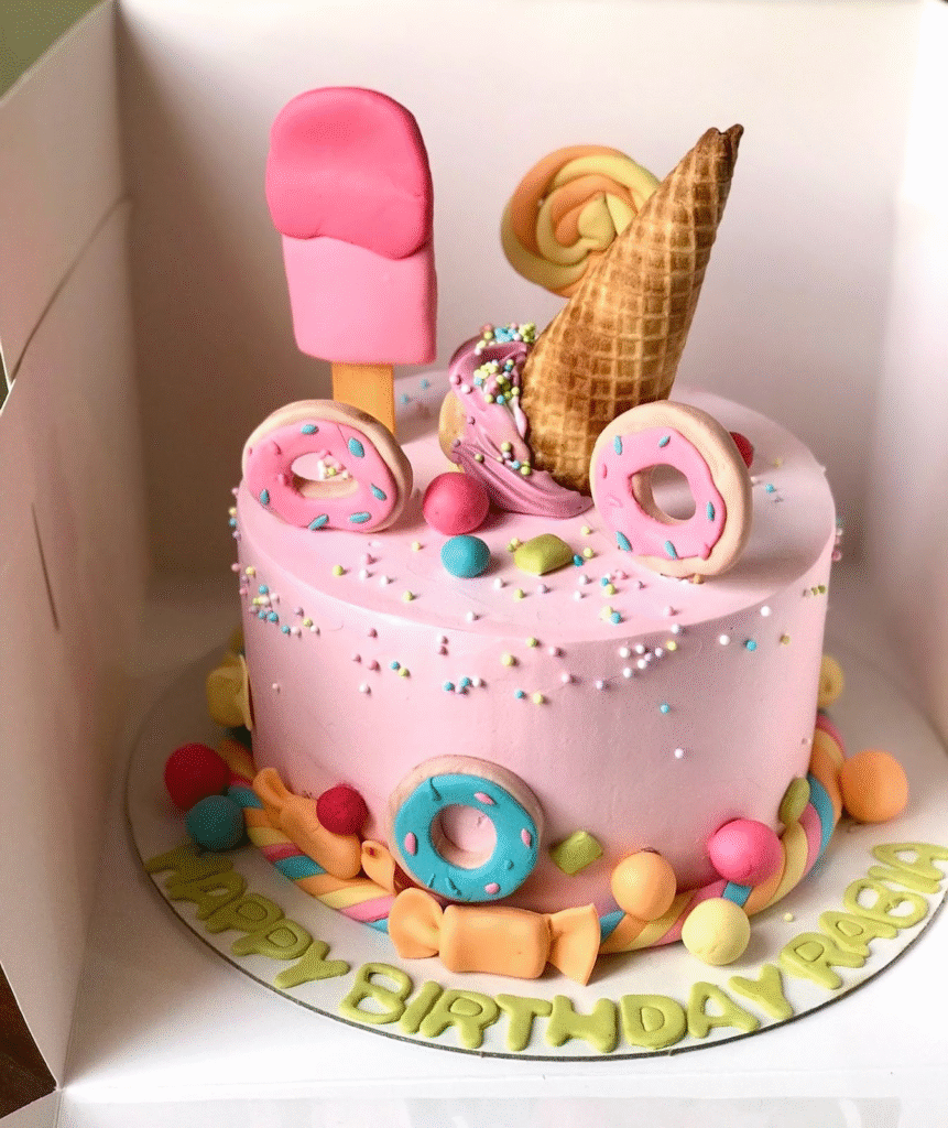 This cake features a playful pink frosting adorned with an array of colorful treats. Donuts, candy, a whimsical ice cream cone, and lollipops top the cake, creating a fun and festive design. The vibrant sprinkles and pastel-colored candies around the base add texture and joy to the look.