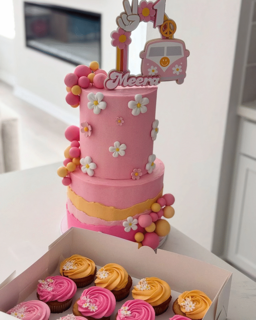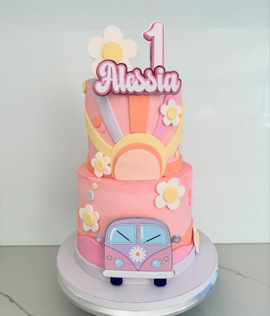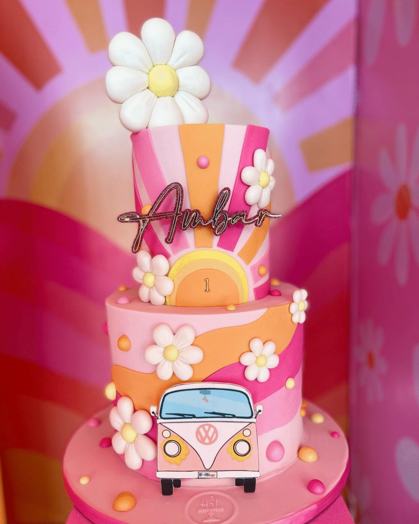 What Makes This Image Stand Out: The vibrant, groovy design with playful flowers and retro VW van creates a fun, joyful vibe, making this cake perfect for an unforgettable first birthday celebration.