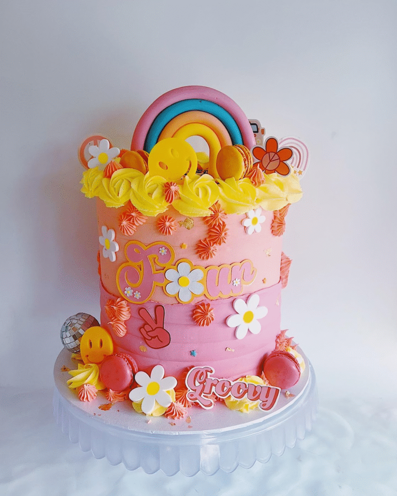 The bold color palette and lively flowers make this cake a fun and energetic centerpiece, ideal for a birthday party with a groovy twist.