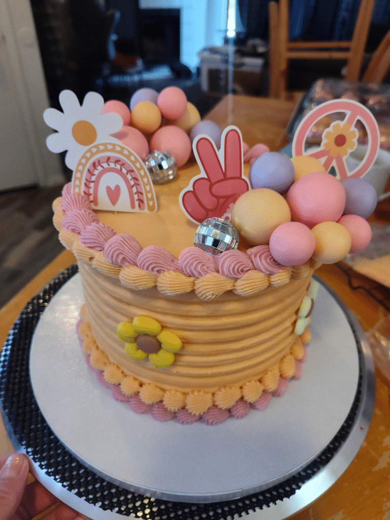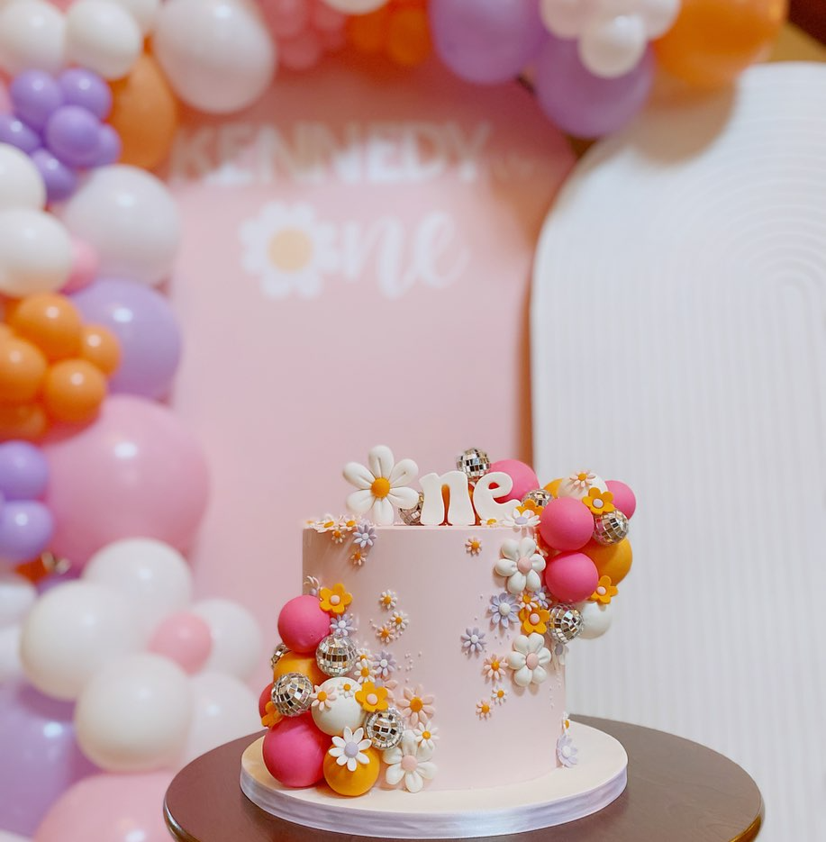 Perfect for a birthday celebration full of energy, this cake captures the essence of positivity and fun. The combination of bold colors, fun flowers, and retro-inspired elements like the rainbow and disco ball makes this cake a standout choice for a lively birthday celebration.