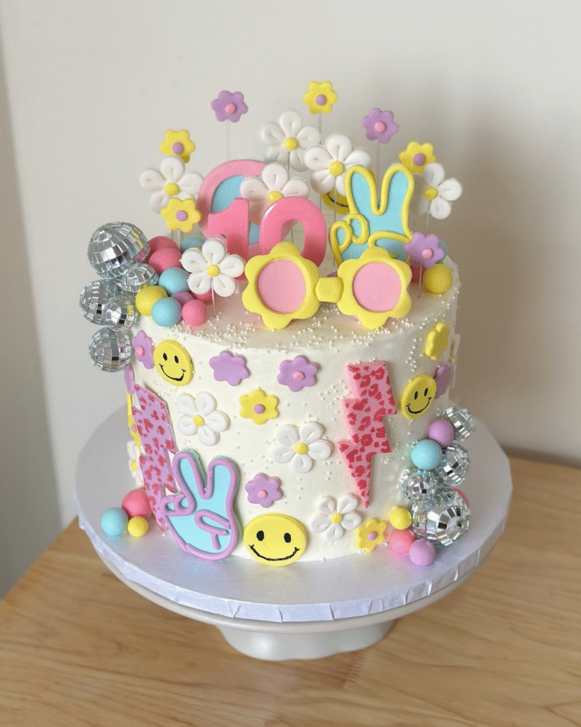 This energetic birthday cake is an explosion of color and fun! The white frosting is decorated with bright pink, yellow, and pastel blue flowers, smiley faces, and playful symbols like peace signs and lightning bolts. The “10” topper adds a bold touch of pink, making this cake a standout centerpiece for the celebration.