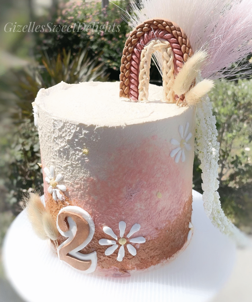This lovely birthday cake features soft, pastel hues in a stunning ombré design. The addition of a gentle pastel rainbow and dried flowers at the top creates a unique, boho-chic vibe. The personalized “2” and playful daisy flowers add a sweet touch, making this cake perfect for a second birthday celebration.