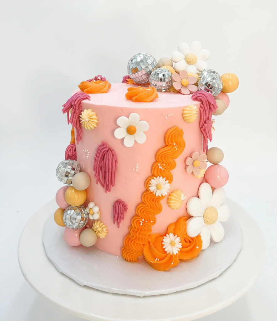 This playful, fun-filled cake is a beautiful mix of colors, flowers, and a touch of sparkle! With bright pink frosting as the base, this cake is decorated with colorful swirls of orange and pink icing, floral accents, and shimmering disco balls. The balance of smooth and textured designs creates an exciting look, while the flowers add a whimsical touch.