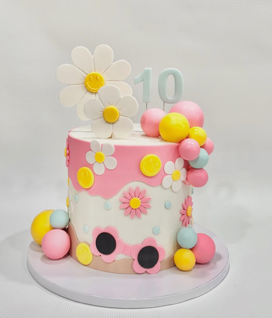 This lively birthday cake radiates positivity with its cheerful pink and white frosting, accented by vibrant, colorful fondant balls and flowers. The playful daisy flowers with smiley faces and the bold “10” topper make it ideal for a milestone birthday celebration.