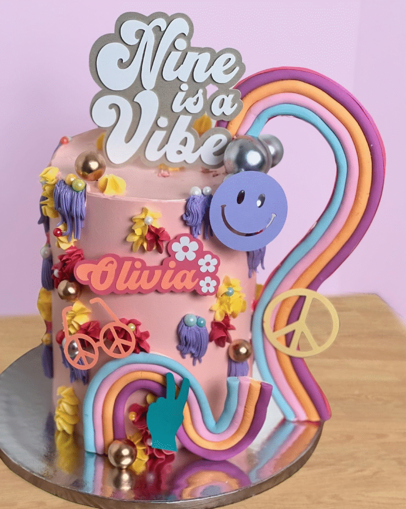 A fun and colorful birthday cake that truly embodies celebration! The soft pink frosting is adorned with colorful rainbow swirls, funky glasses, and the words “Nine is a Vibe” in a stylish font. Playful accents like flowers, peace signs, and smiley faces add to the joyful vibe.