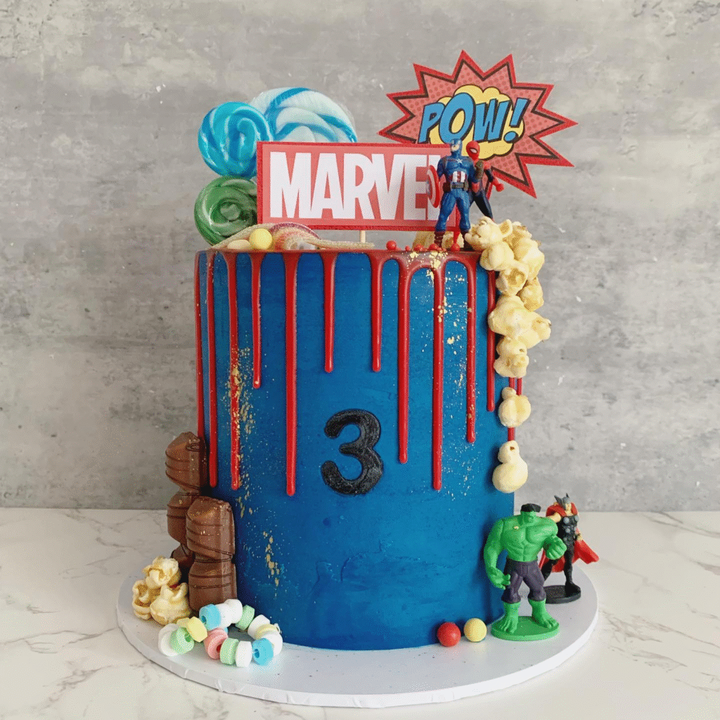 A deep blue base with bold red drip icing creates an eye-catching centerpiece. The number “3” stands tall in the middle, making it the perfect birthday treat for a little Marvel fan.
