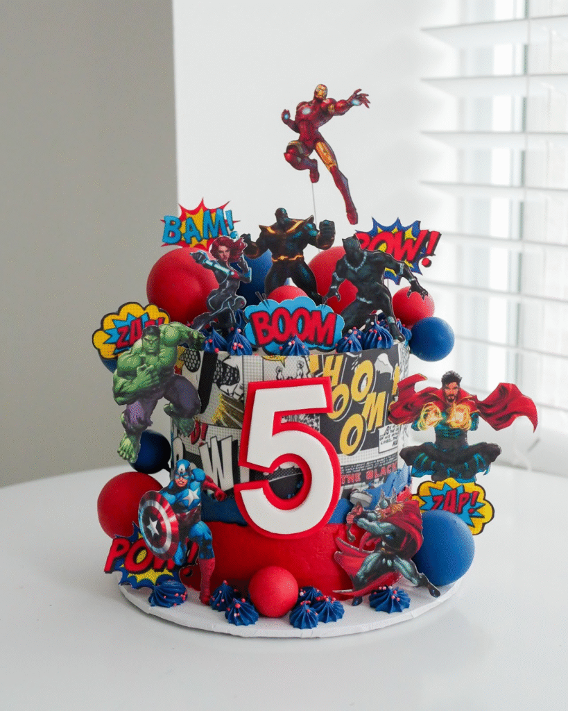 Around the sides, heroes like Hulk, Captain America, and Doctor Strange guard the cake while Thor and Black Panther add even more flair. The oversized “5” centerpiece makes it a true birthday showstopper.