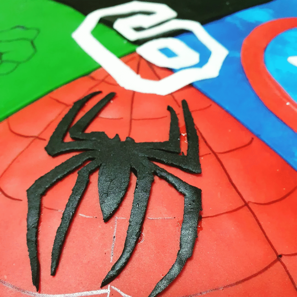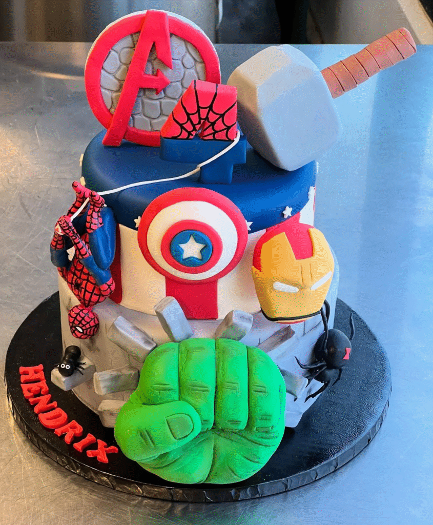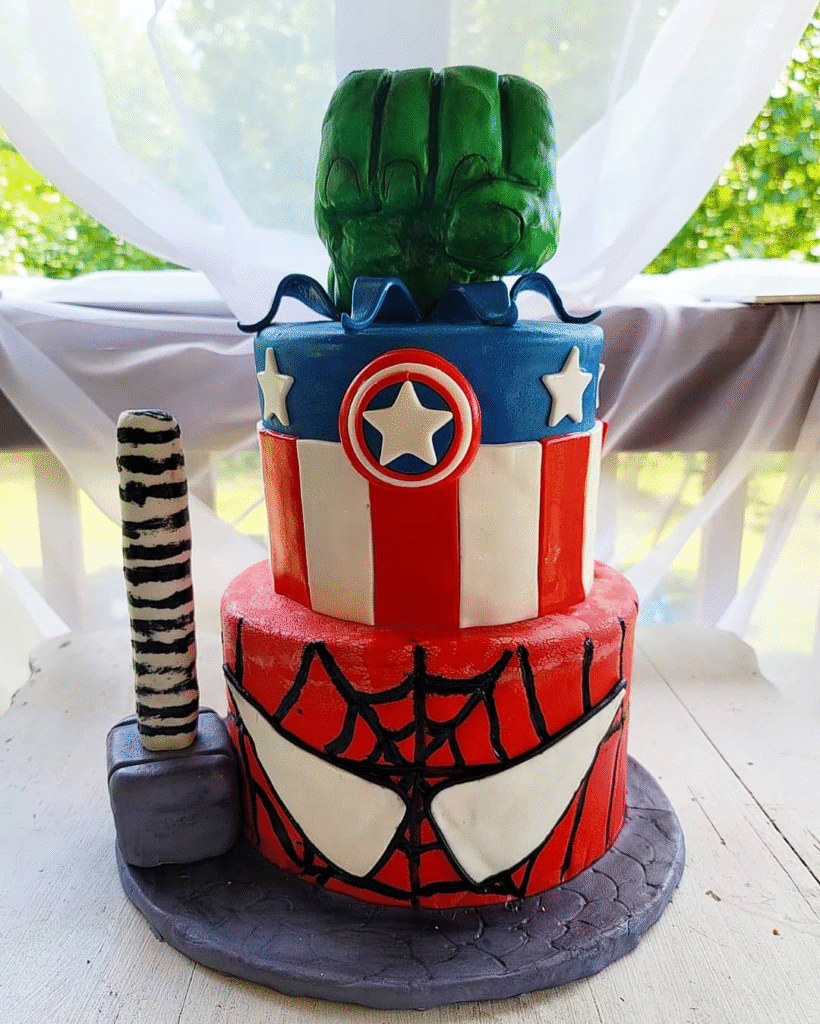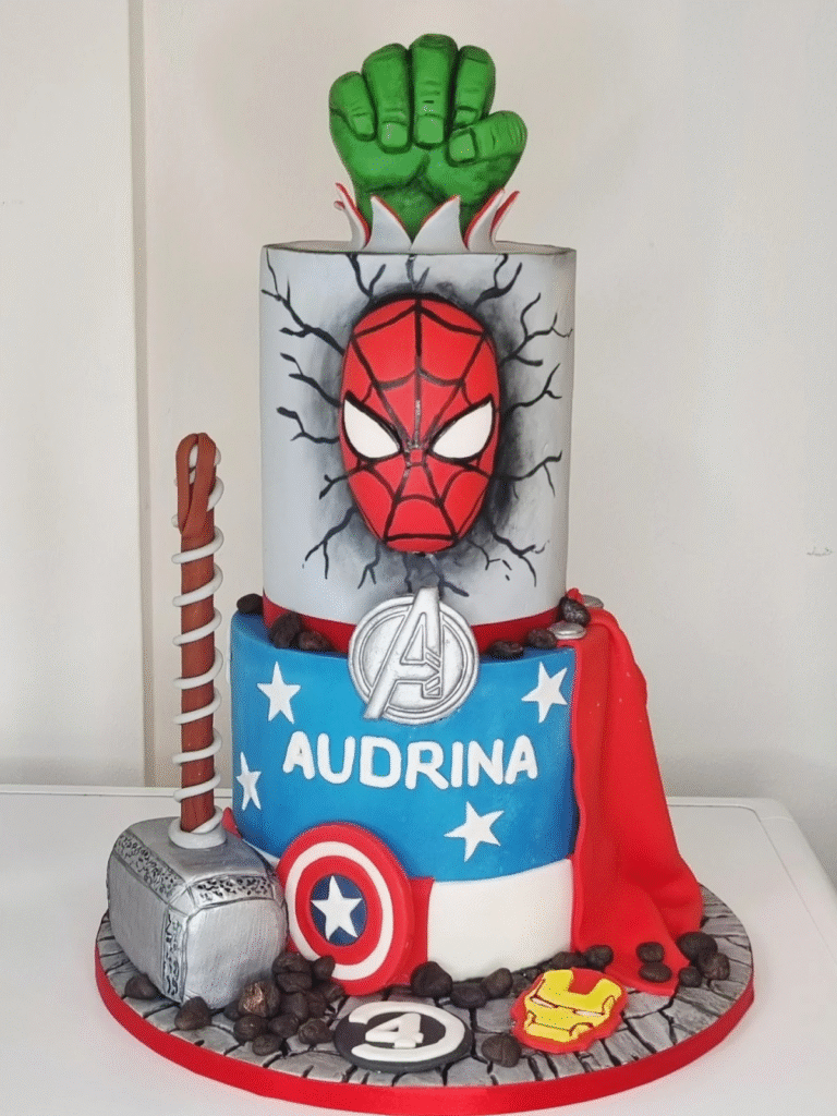 Thor’s mighty hammer rests on top alongside the Avengers logo, making the entire design an unforgettable tribute to Earth’s greatest heroes. Every detail, from spiders to action-packed toppers, ensures this cake is perfect for superhero lovers of all ages.