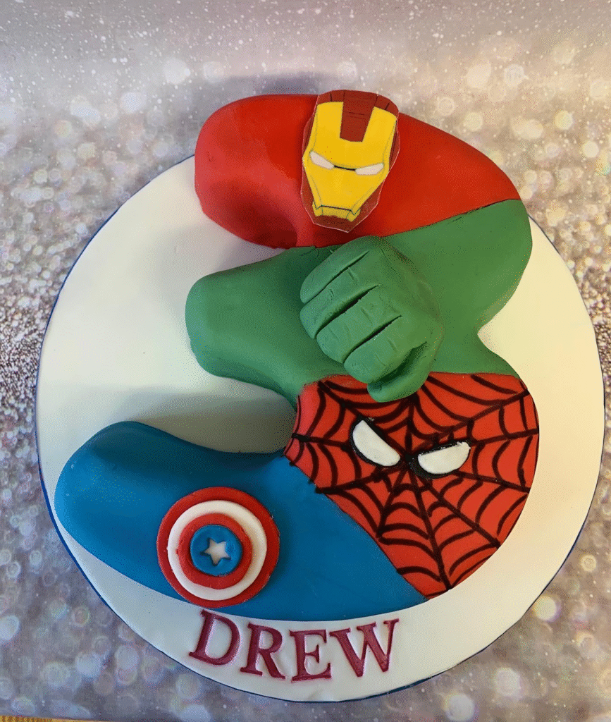 Captain America’s shield at the base adds another heroic touch, making the cake truly feel like a tribute to the Avengers. Personalized with the name “Drew,” it’s a delightful centerpiece that captures the joy of a themed birthday celebration perfectly.