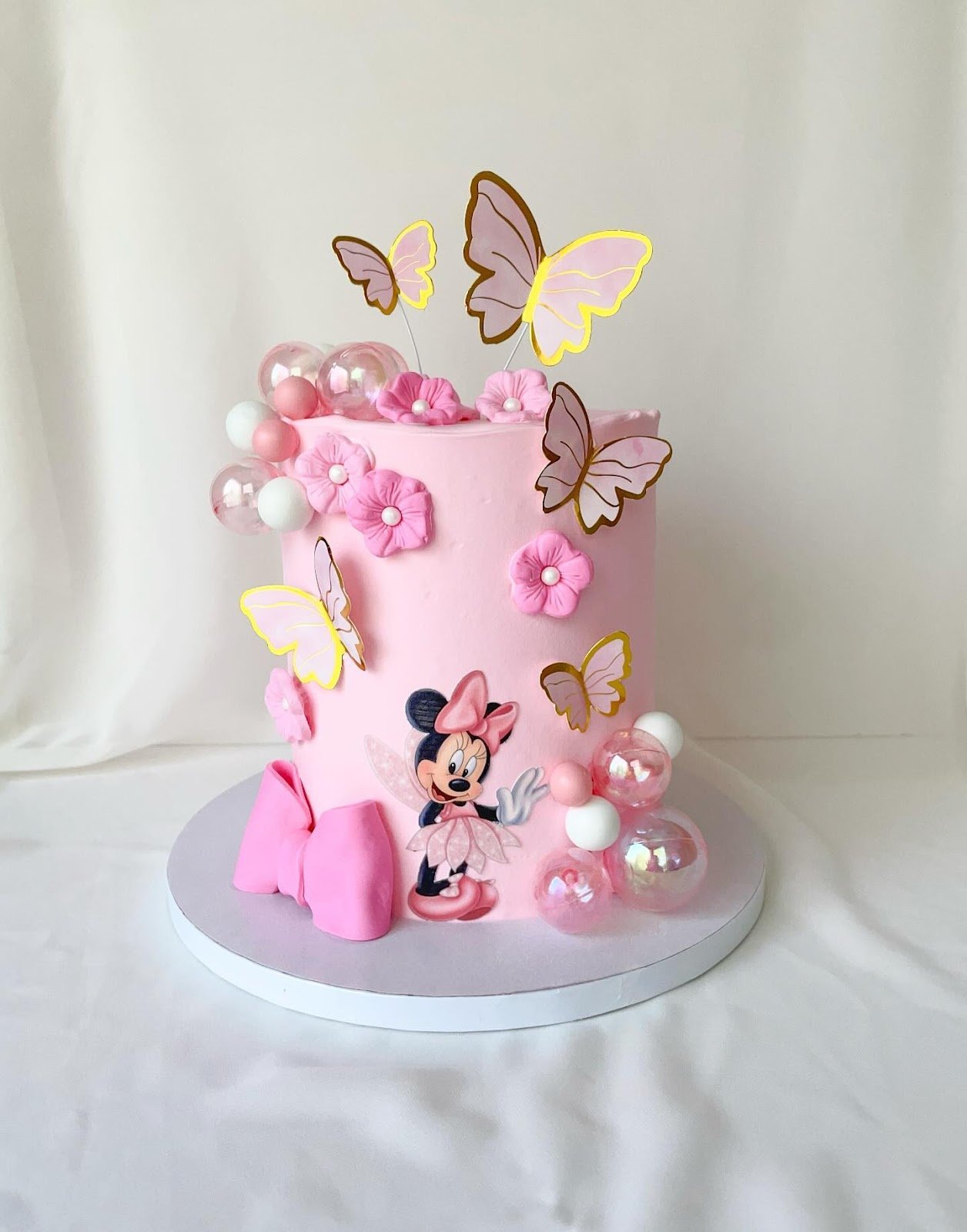 The cake balances airy textures with playful charm, using light hues and floating butterflies to add grace and movement. Perfect for a magical birthday moment, the design feels straight out of a fairytale—elevated, enchanting, and fit for a Minnie-loving birthday girl.