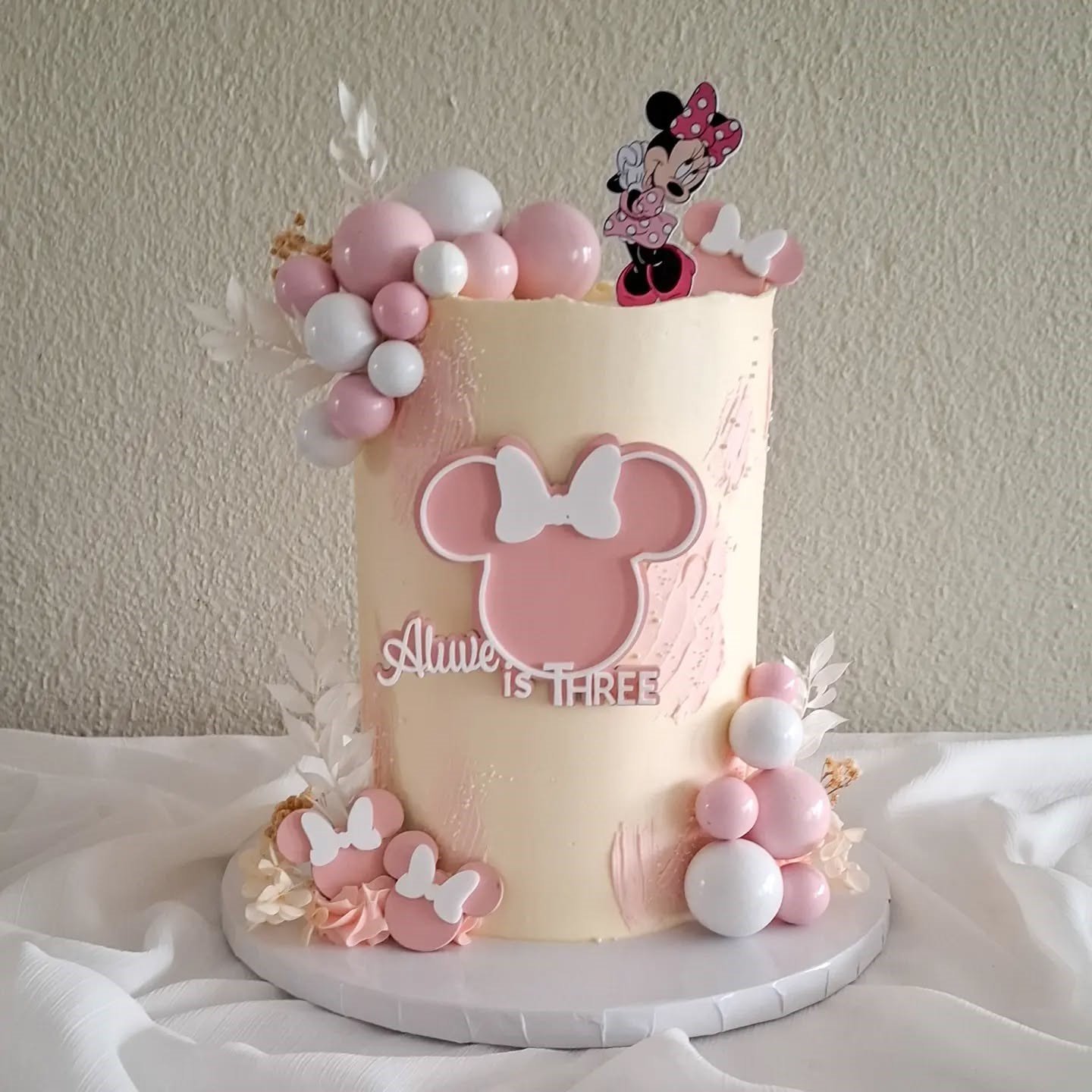 Tall and sophisticated, this blush-toned cake celebrates Aluvia’s third birthday with soft pinks, whites, and gentle textures. A minimalist Minnie silhouette with a white bow serves as the focal point, framed by pastel balloon clusters and soft floral accents.