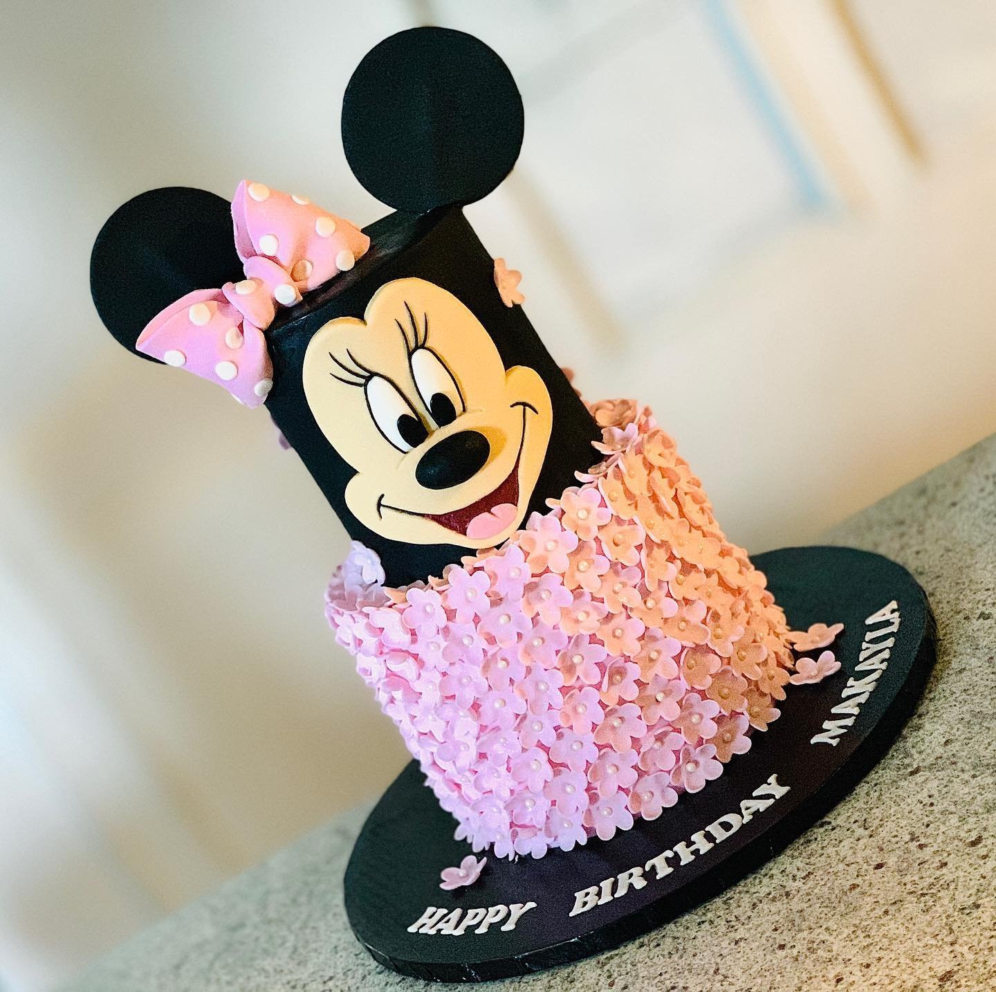Playful design and expert fondant artistry make this cake an eye-catching celebration piece. The angled structure adds a fun, modern twist, while pastel petals provide an elegant, girlish charm ideal for any young Minnie fan’s birthday party.