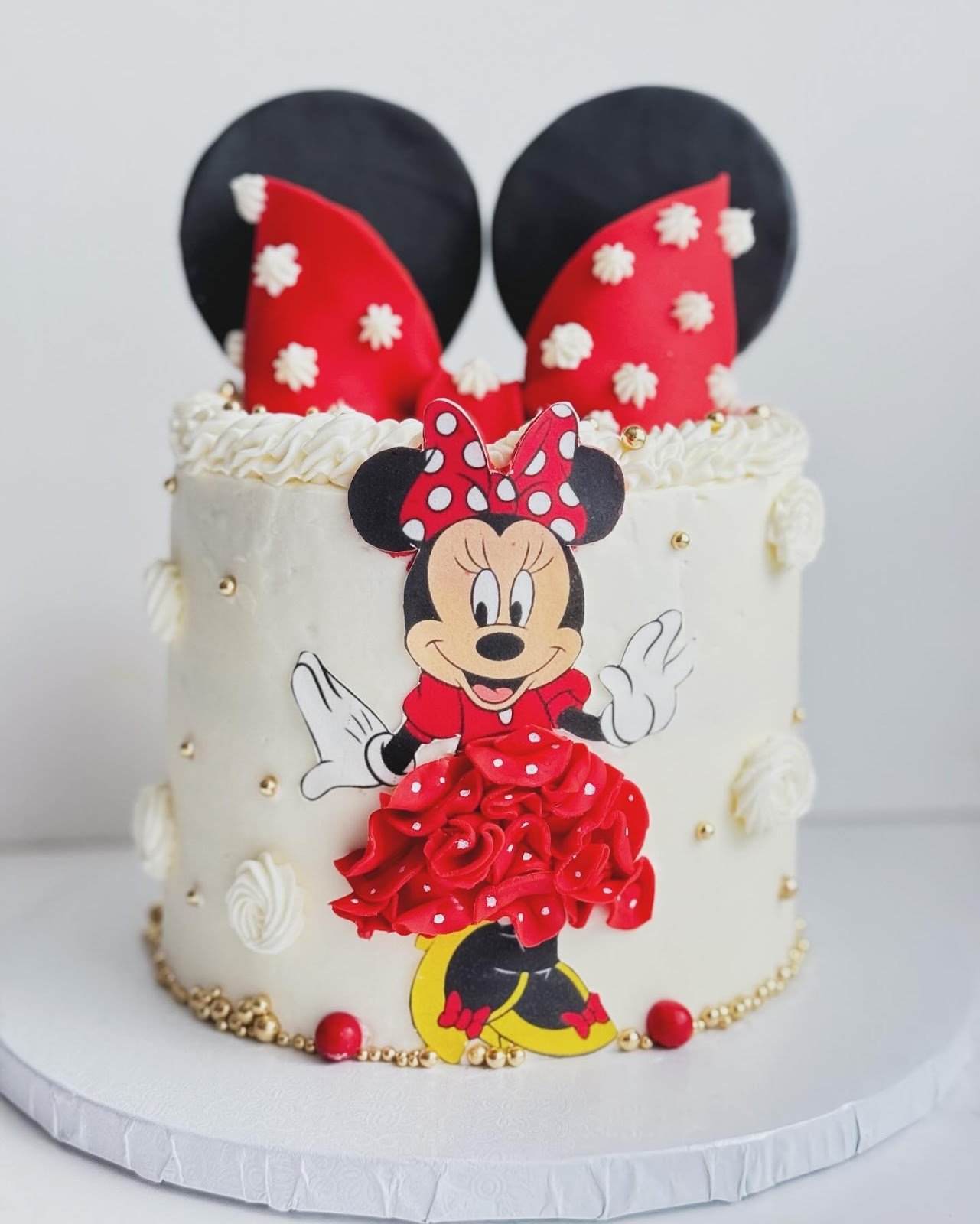 Elegant white frosting forms the base of this cake, embellished with piped rosettes and metallic gold sugar pearls. A cheerful Minnie Mouse cutout adds character charm, with her signature red outfit upgraded by a 3D polka-dot ruffle skirt that pops right off the cake.