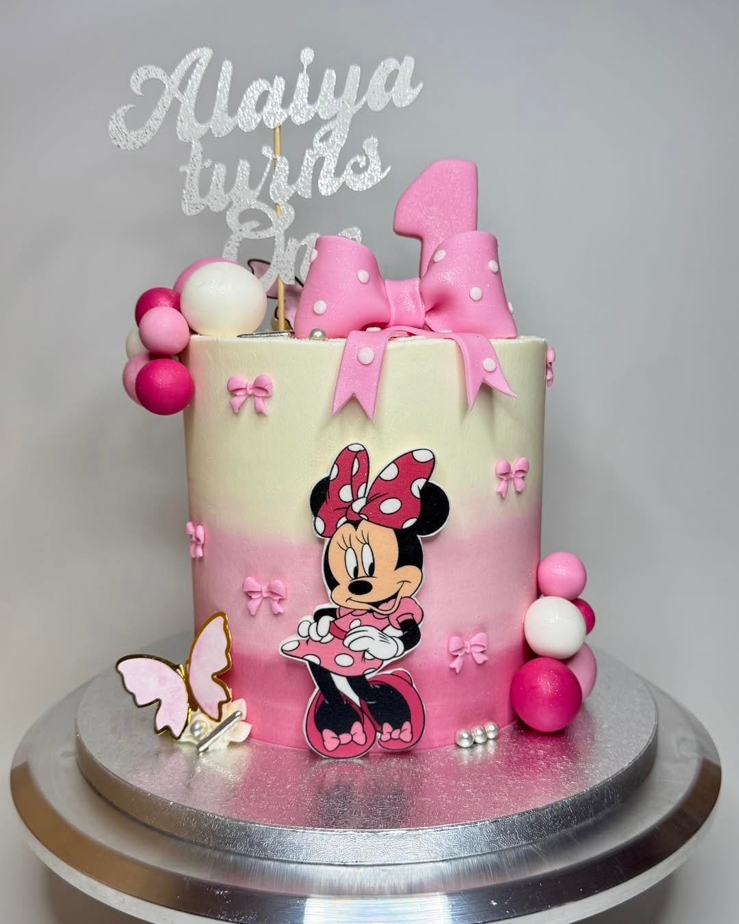 Soft pink ombré frosting sets a dreamy tone for this charming Minnie Mouse-themed birthday cake. A fondant Minnie cutout dressed in pink polka dots brings the character to life, surrounded by delicate fondant bows, edible pearls, and bold color-blocked spheres.