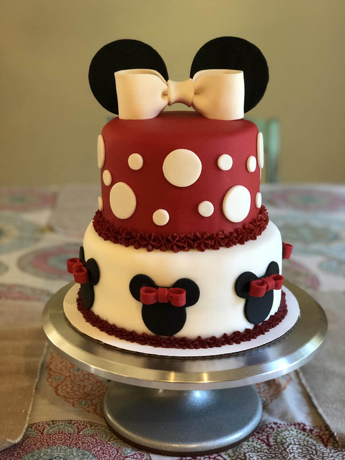 Each layer is carefully detailed with fondant elements and a touch of whimsy, making the design both festive and timeless. It’s a standout centerpiece for a Minnie Mouse-themed birthday celebration.