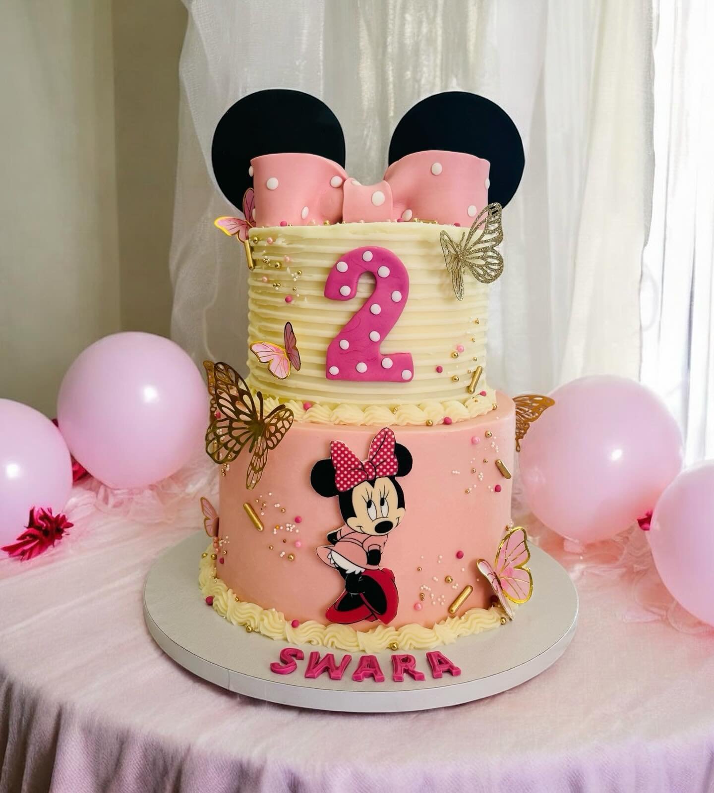 Blending pastel pink and ivory tones, this two-tier cake creates a whimsical Minnie Mouse celebration for Swara’s second birthday. The top tier features a ridged buttercream texture with a large polka-dot number “2,” while gold and pink butterflies flutter around delicate edible pearls and sprinkles.