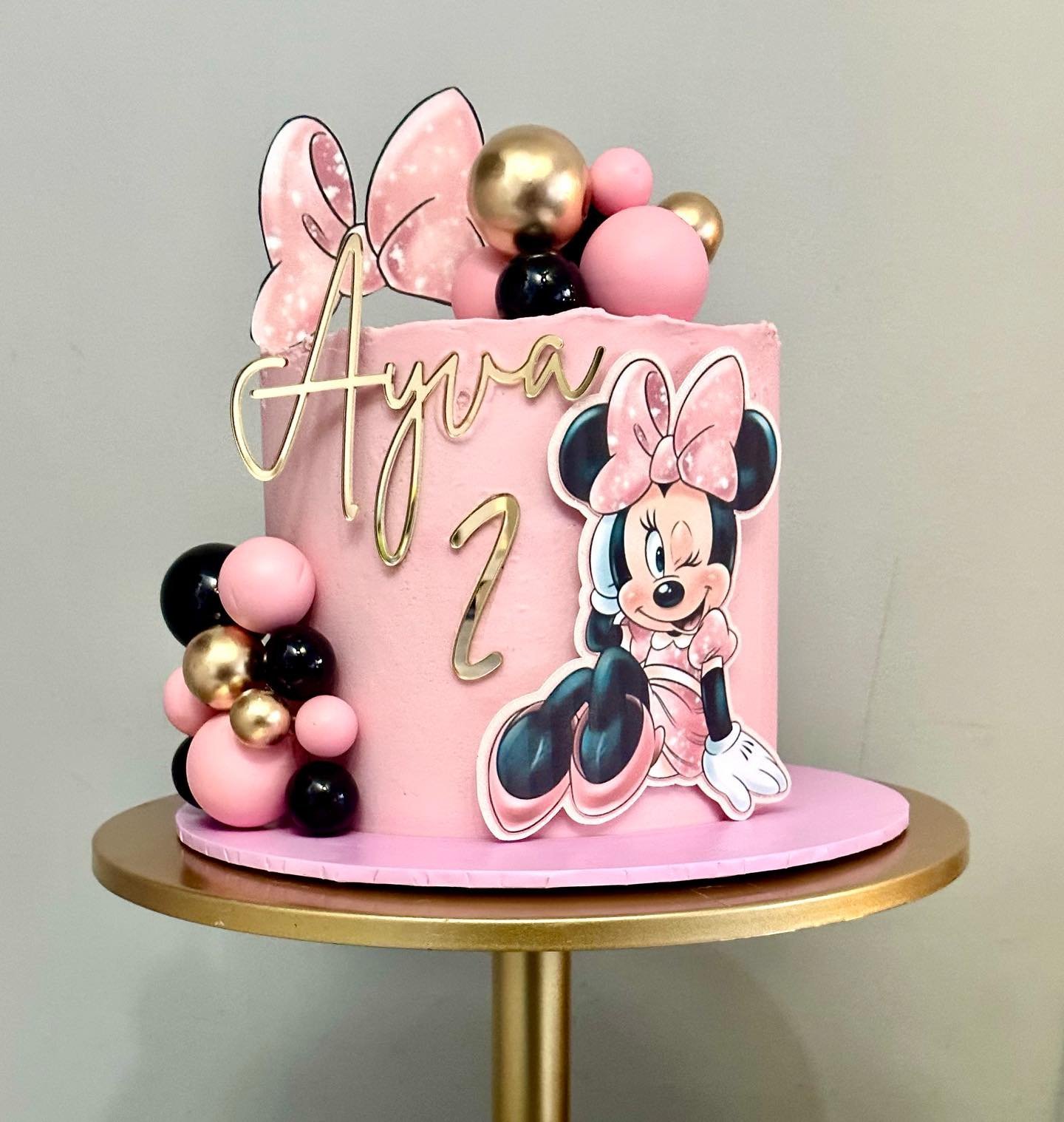 Soft pink buttercream sets a stylish base for this tall single-tier cake, adorned with shiny gold, black, and pink edible spheres. A seated Minnie cutout adds playfulness, dressed in a pastel outfit with a matching sparkly pink bow.