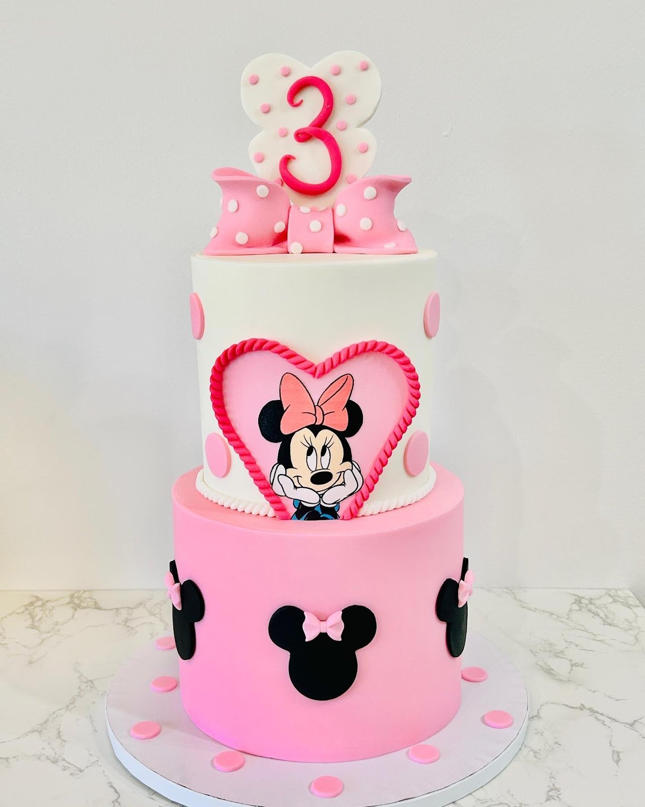 Two beautifully stacked tiers showcase a pink and white Minnie Mouse birthday cake full of playful charm. The top layer features a heart-framed Minnie with a bashful pose, wrapped in pink fondant polka dots and topped with a layered pink bow and number 3 accent.