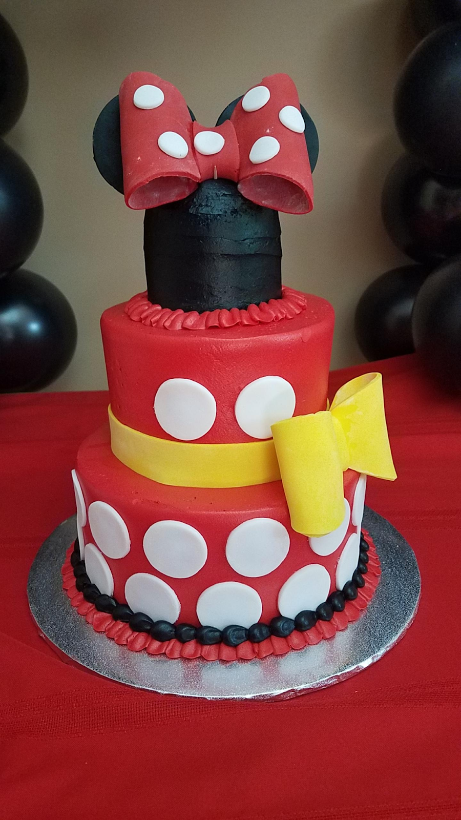 Playful and bold, this two-tier birthday cake captures the iconic Minnie Mouse theme with vibrant red fondant, large white polka dots, and a bright yellow bow. The top tier features black Minnie ears and a signature red bow with white spots, creating an unmistakable character silhouette.