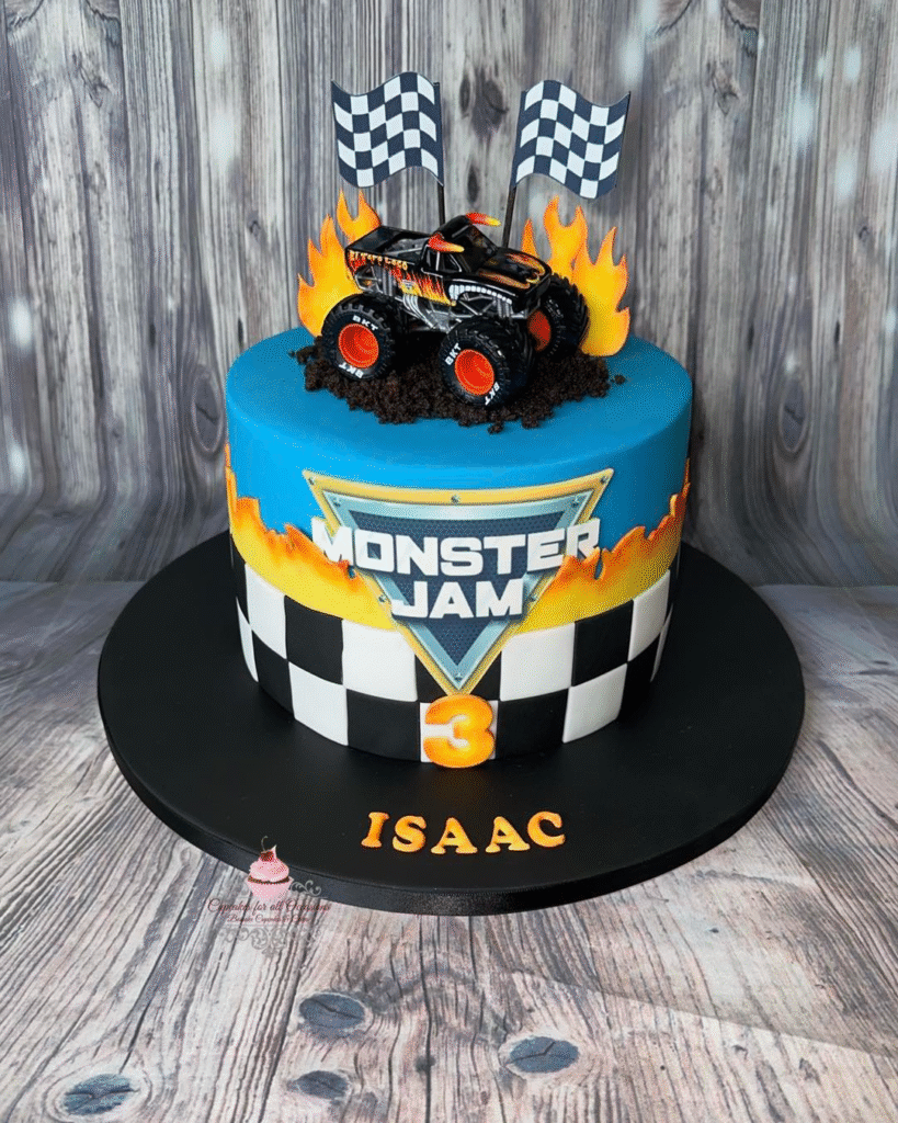 Flaming orange fondant designs and a black-and-white checkered border enhance the racing theme. The official Monster Jam logo at the center ties everything together, making the cake a thrilling showpiece that captures the true spirit of monster truck fun.