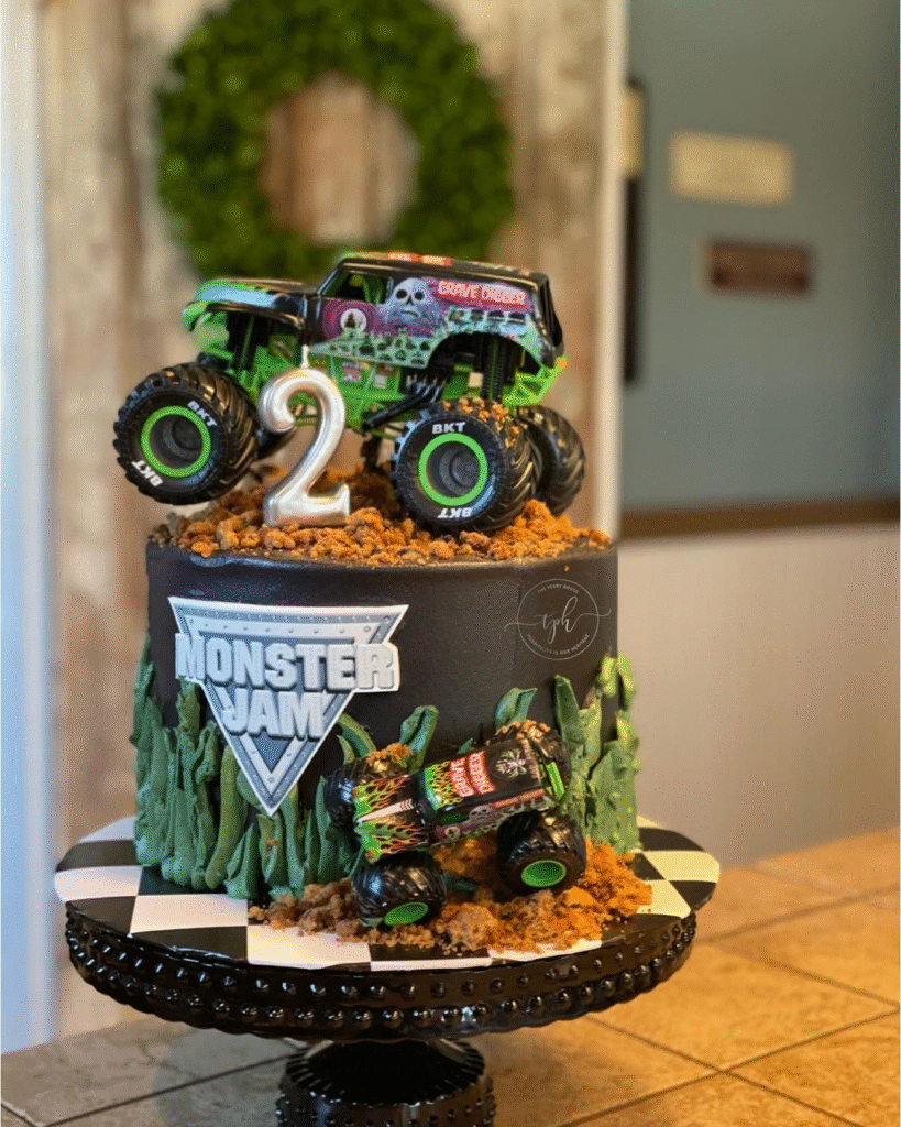 Bold design and rugged details make this cake a perfect tribute to Monster Jam excitement. The dark base highlights green frosting accents shaped like grass, while crumbled cookie dirt adds realistic texture. A silver number “2” marks the milestone birthday with style.