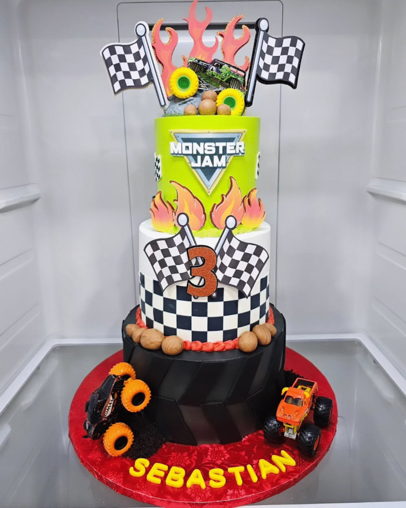 This vibrant Monster Jam cake is a true race-themed delight, featuring bold flames, a checkered flag design, and personalized elements. At the top, two monster trucks rev up the excitement, with a number “4” and the name “Ethan” bringing a personal touch. The black tire at the bottom adds a creative, unique base that fits the racing vibe perfectly.
