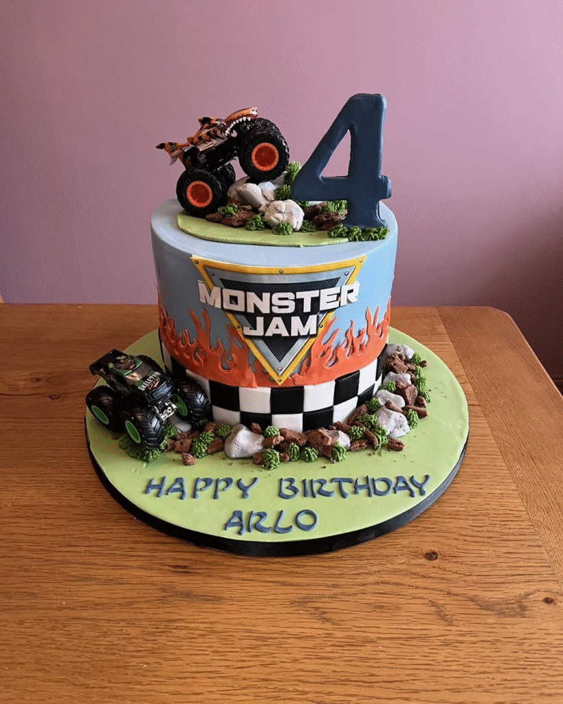 The striking blue frosting and the Monster Jam logo make it a standout cake for any birthday celebration. It’s an ideal cake for fans of all things monster trucks and high-speed races.