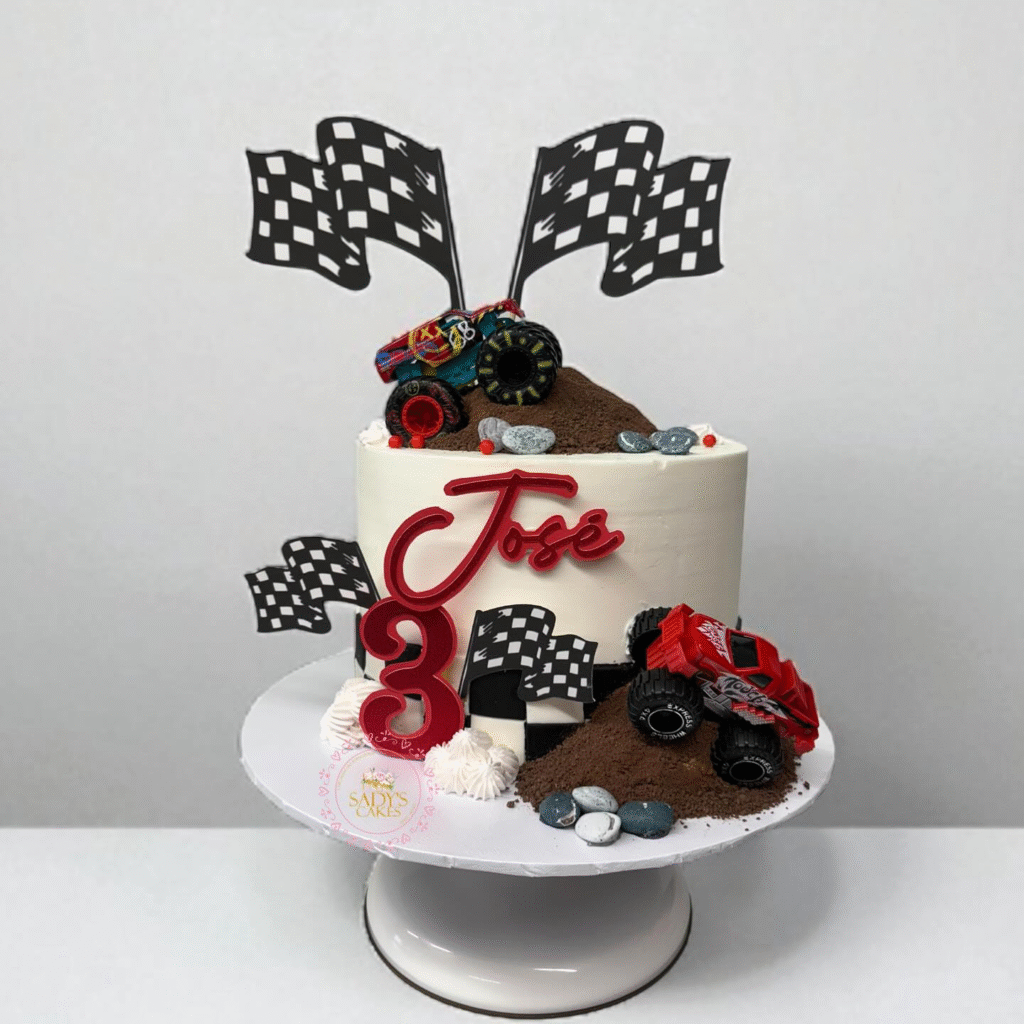 A bold “José” and number “3” add a personal touch to the cake, while the toy trucks climbing the “dirt mound” create an adventurous scene. Every detail highlights the racing theme, making it perfect for any young racing enthusiast’s party.