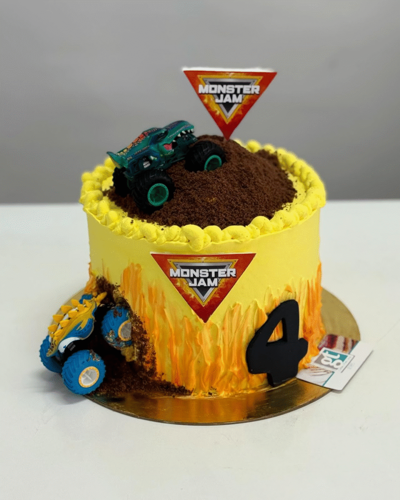 This exciting birthday cake captures the thrill of Monster Jam with vibrant yellow frosting and bold flames that wrap around the bottom. The toy monster trucks climb a dirt mound, adding a fun, adventurous vibe, while Monster Jam logos highlight the racing theme.