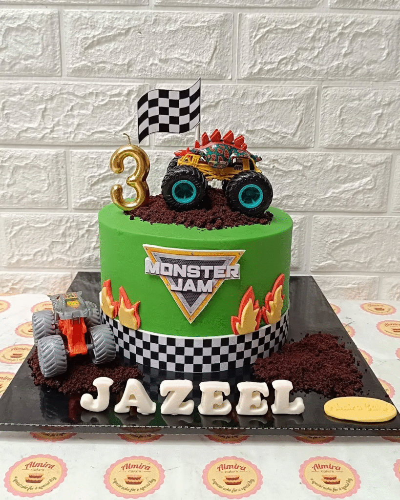 Personalized with the name “Jazeel” in bold, white letters, the cake is perfect for a little one’s Monster Jam-themed birthday. The number “3” adds a special touch, making it ideal for a three-year-old racing fan.