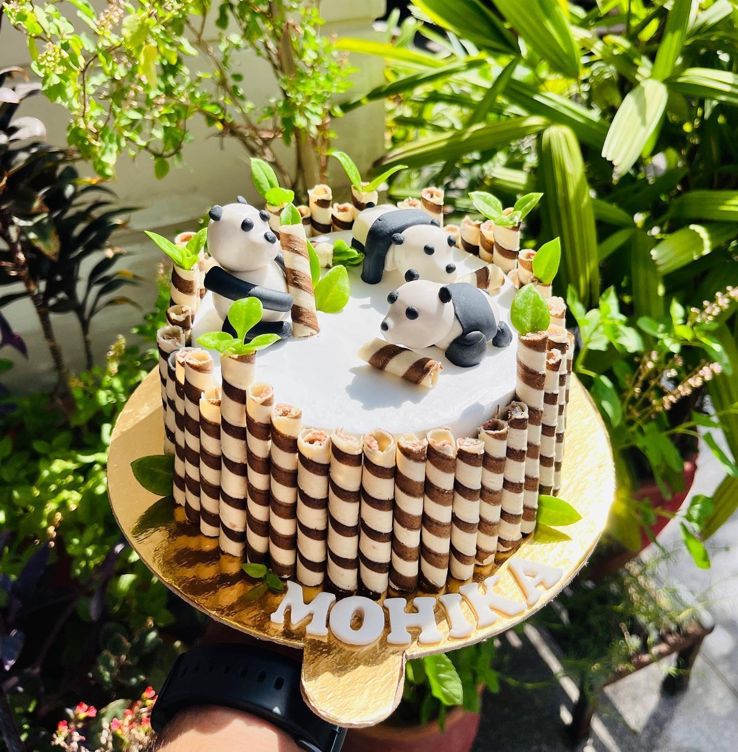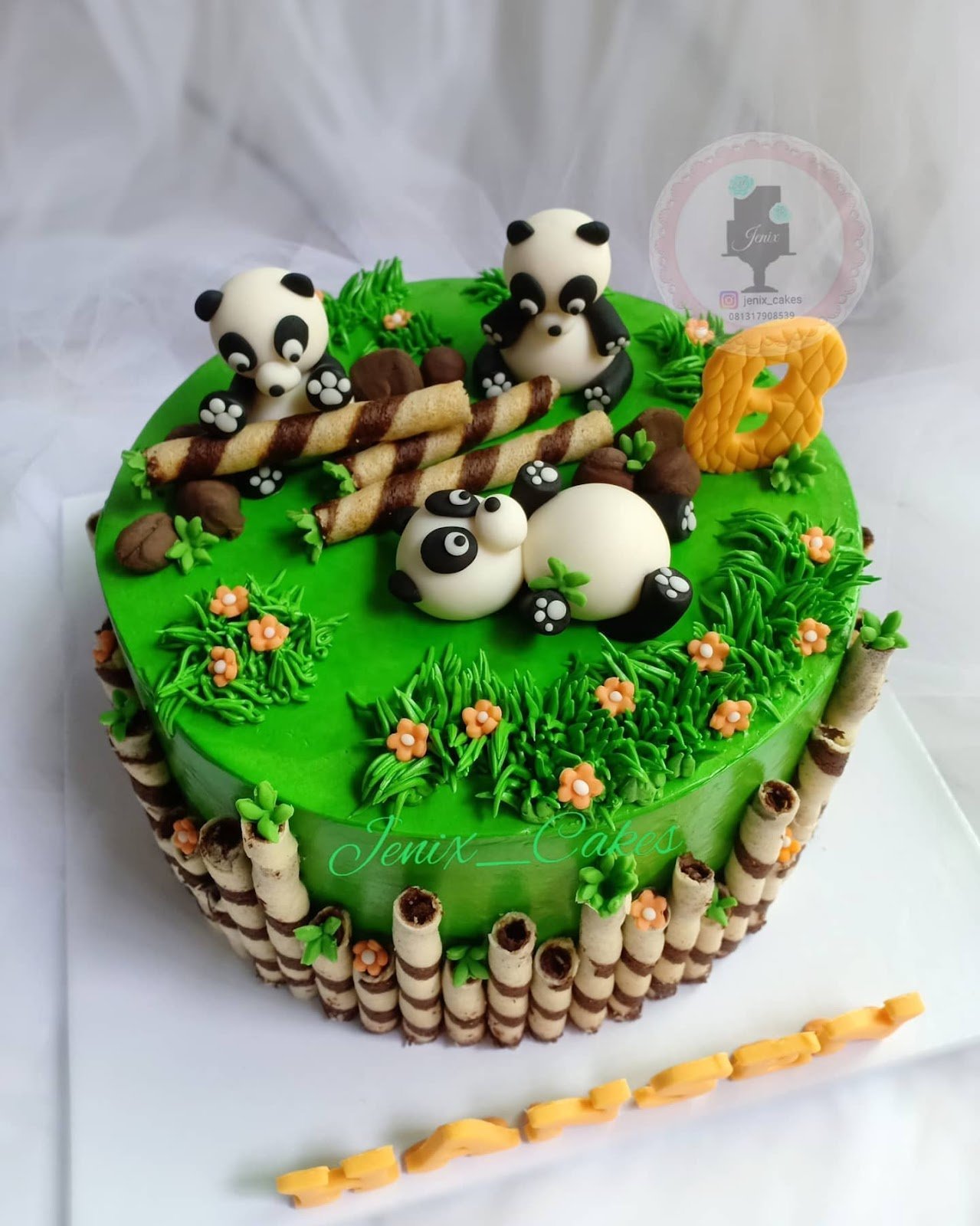 Playful pandas scattered across the top bring a cheerful and whimsical charm, making the cake feel lively and fun. The clever mix of colors, from creamy whites to fresh greens and warm wafer tones, ensures it stands out as a centerpiece.