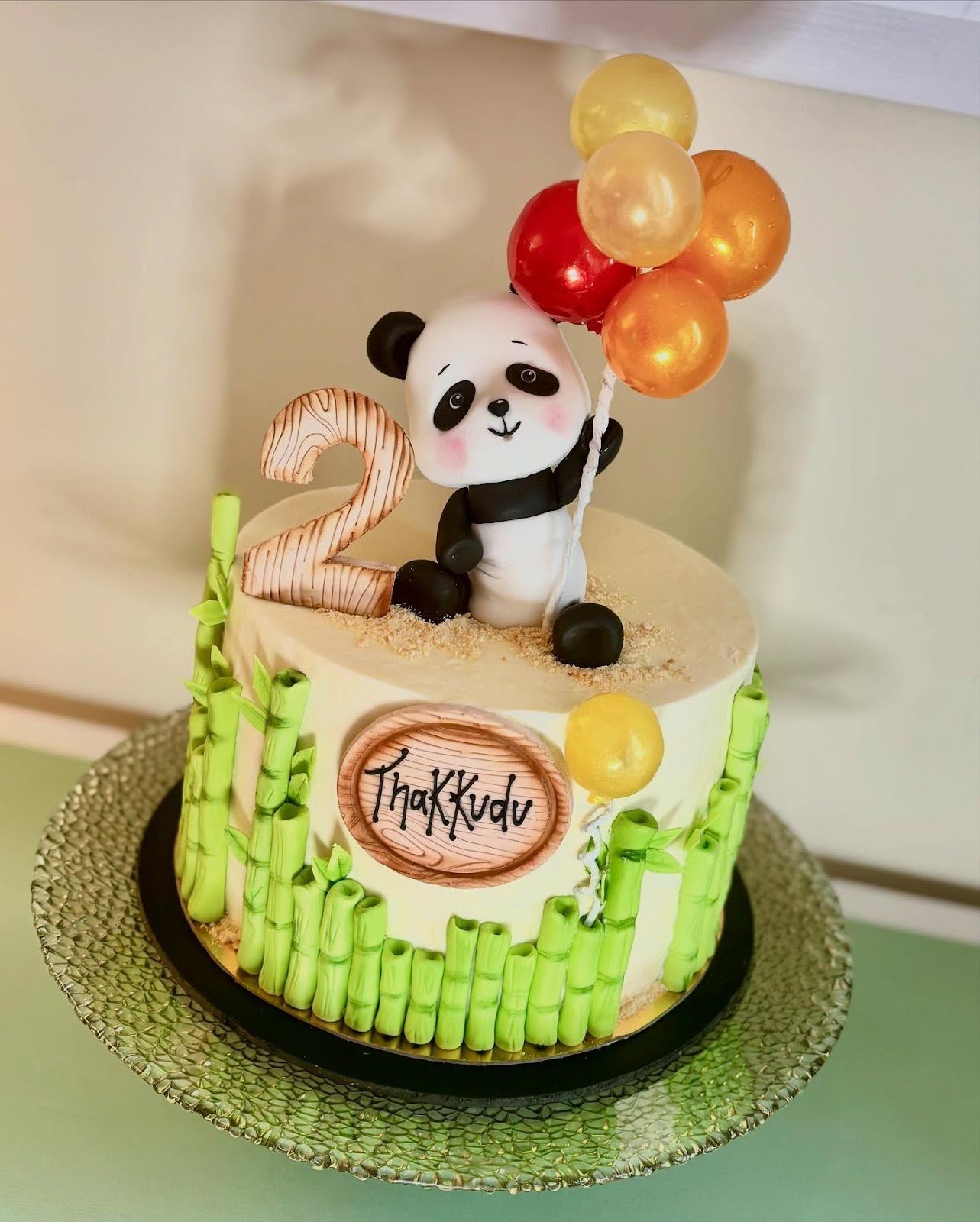 A delightful panda figurine sits atop this creamy cake, holding a cluster of golden, orange, and red balloons. The number “2” stands beside it in a wood-textured design, adding a playful birthday highlight with a natural theme.