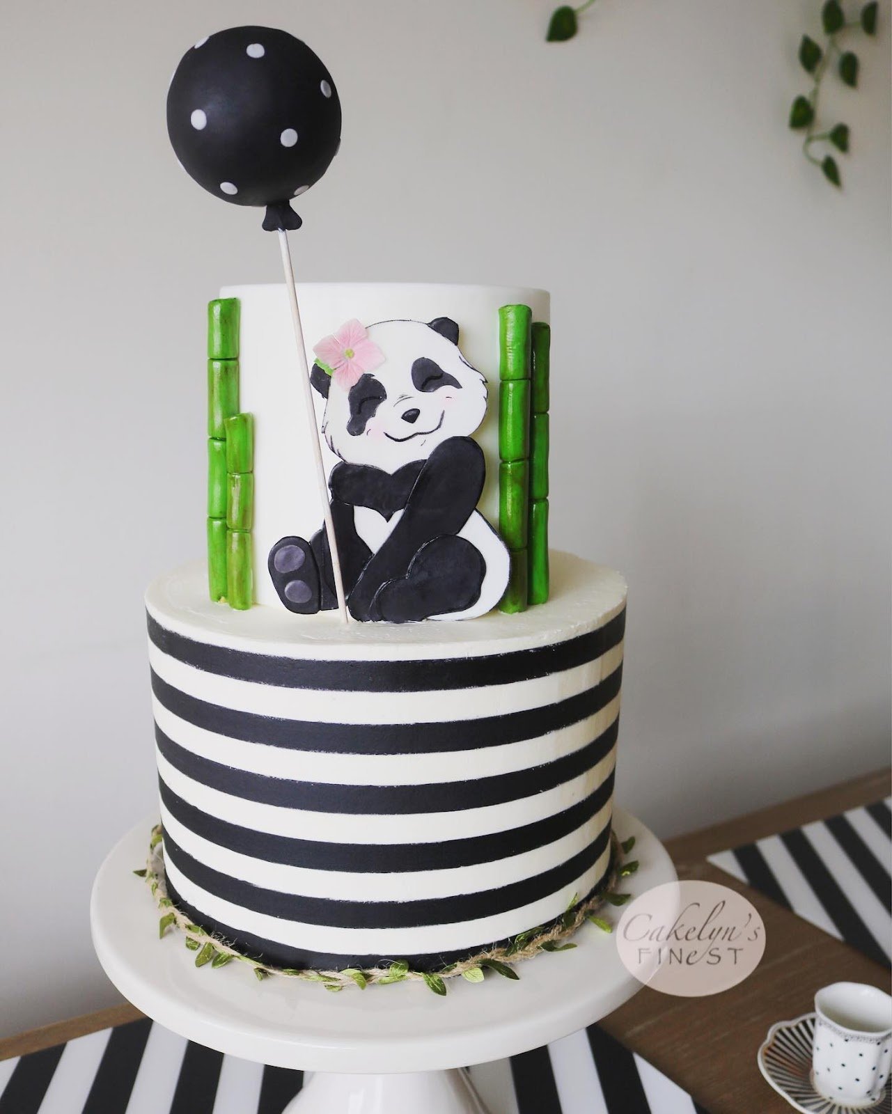 What Makes This Image Stand Out: The striped pattern, bamboo accents, and balloon topper give this panda cake a stylish and creative finish.