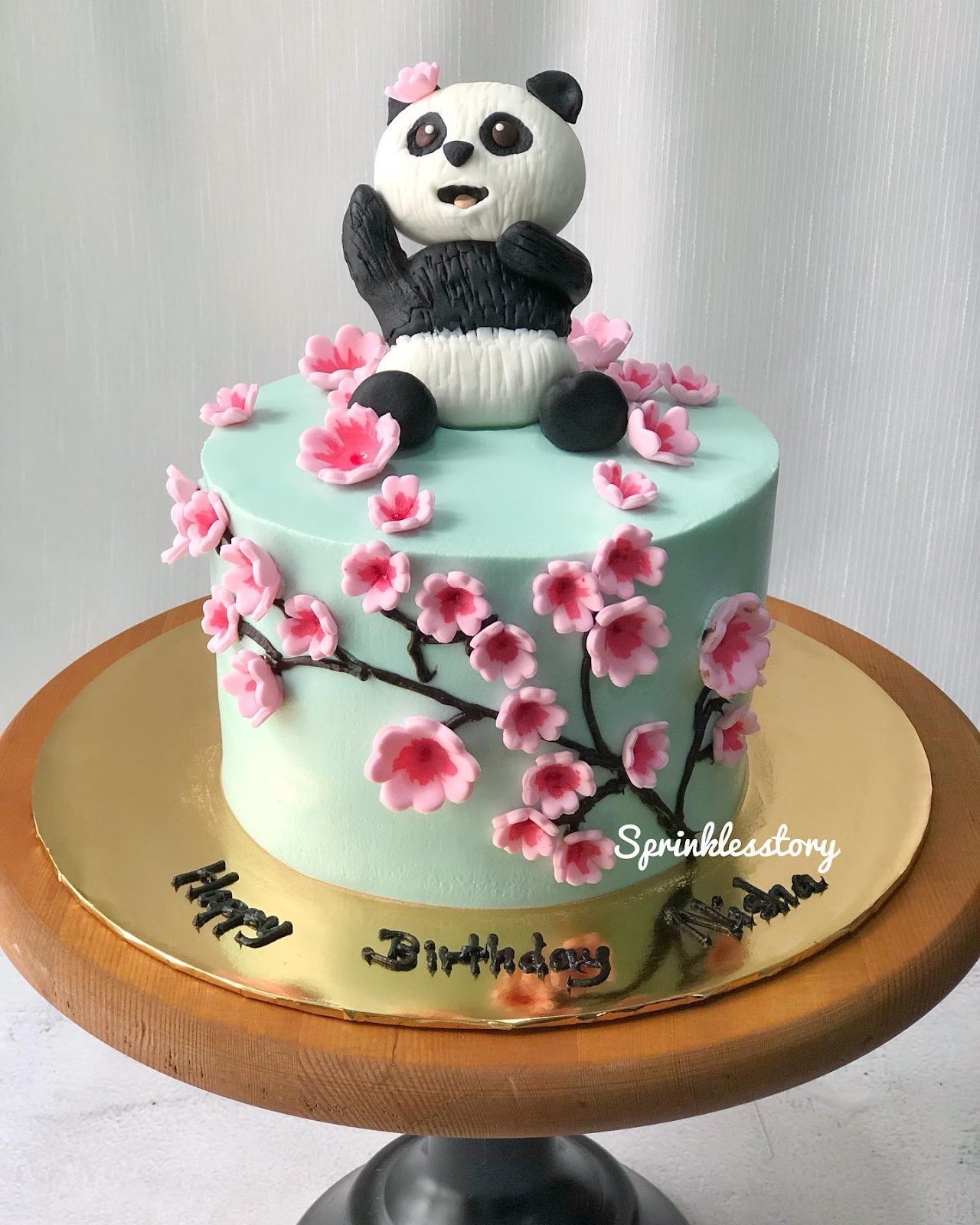 Pastel green frosting creates a soft backdrop for this cake, decorated with delicate pink cherry blossoms cascading around the sides. A joyful panda topper sits proudly on top, bringing playful character and charm to the floral-inspired design.