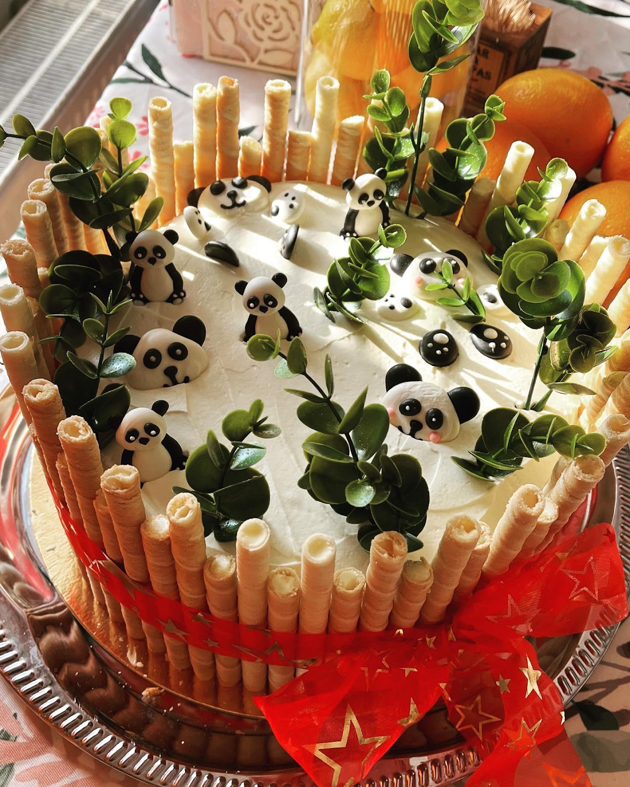 Panda-Themed Wafer Roll Cake with Playful Toppers