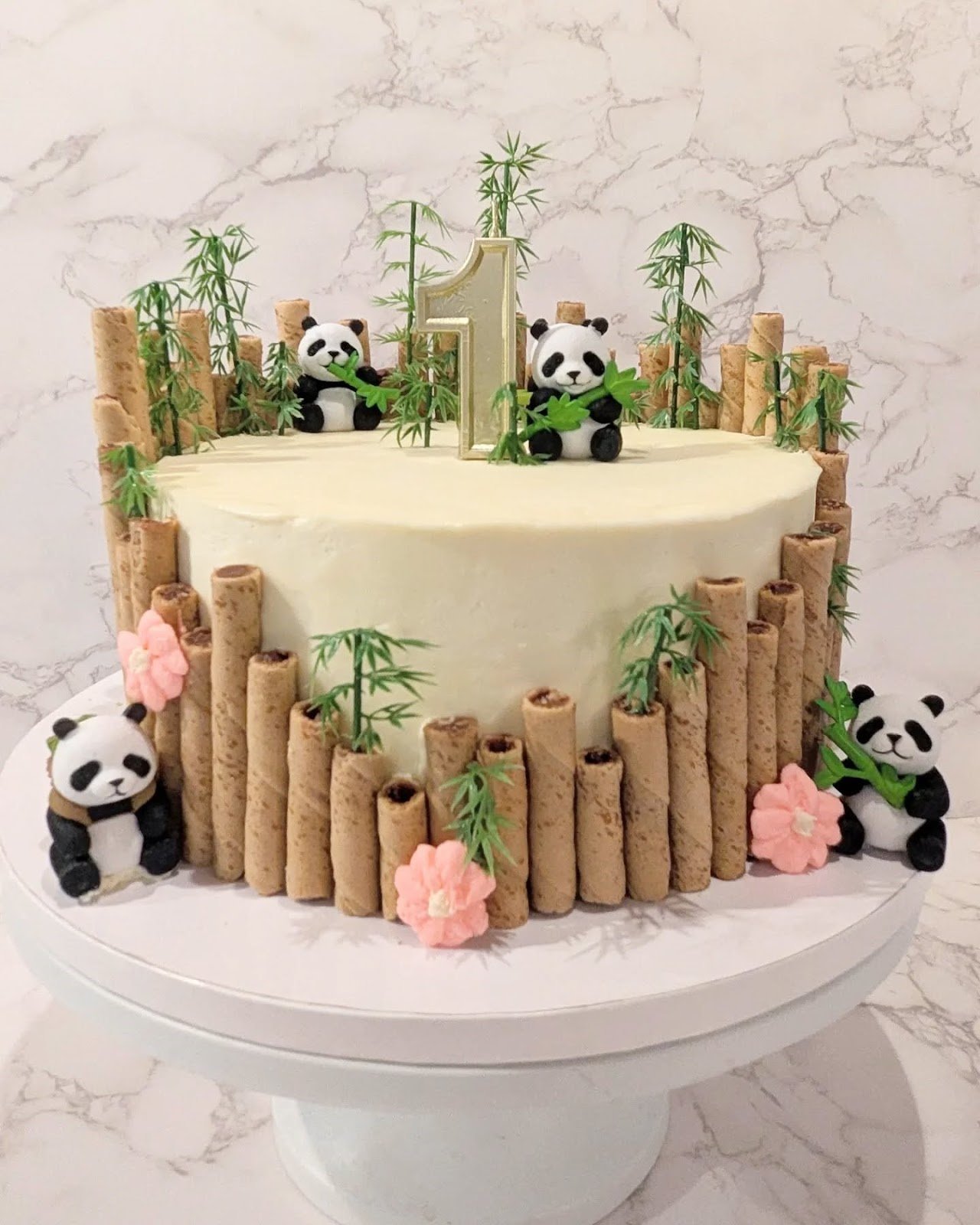 Soft cream frosting forms the base of this delightful first birthday cake, decorated with wafer roll “bamboo” and tiny panda toppers holding leafy greens. Pink flowers and sprigs of greenery add a natural touch, making it elegant yet playful.