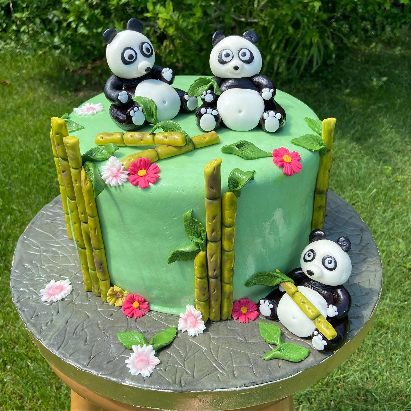 Green Panda Garden Birthday Cake with Bamboo and Flowers