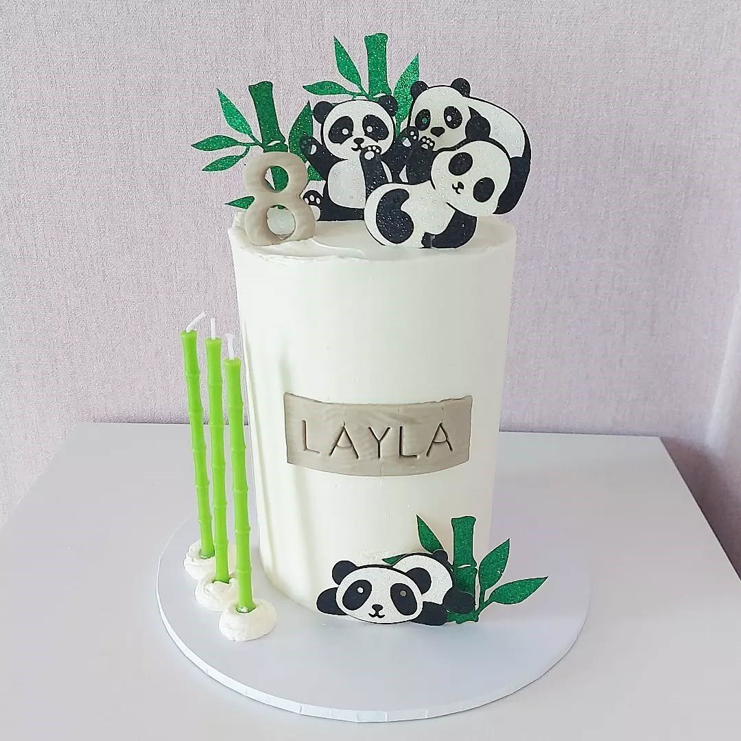What Makes This Image Stand Out: The mix of personalized name details, panda figures, and vibrant bamboo decorations creates a unique and playful birthday cake design.