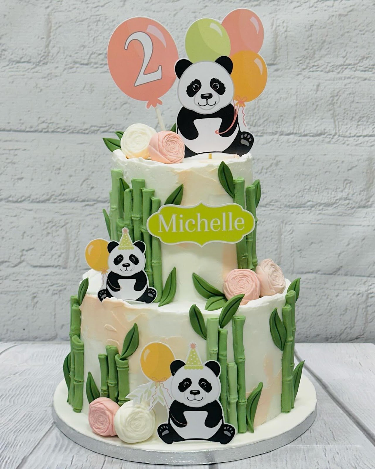 Green bamboo stalks and soft pink-and-white rosettes decorate the tiers, giving the cake a lively and natural look. Personalized with the name “Michelle” and topped with a bright “2,” it perfectly balances cuteness, elegance, and a celebratory vibe.