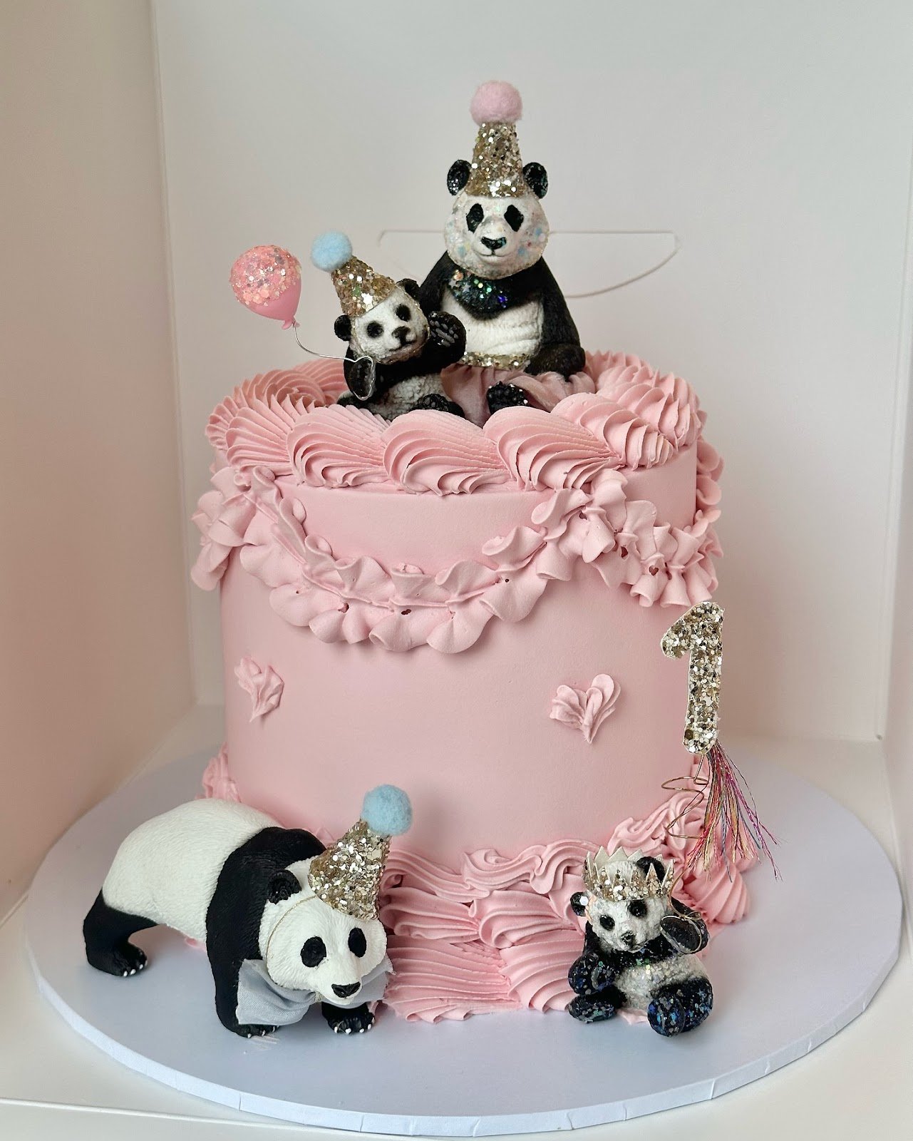 What Makes This Image Stand Out: The glittery panda toppers and pink ruffled frosting create a magical and celebratory first birthday cake design.
